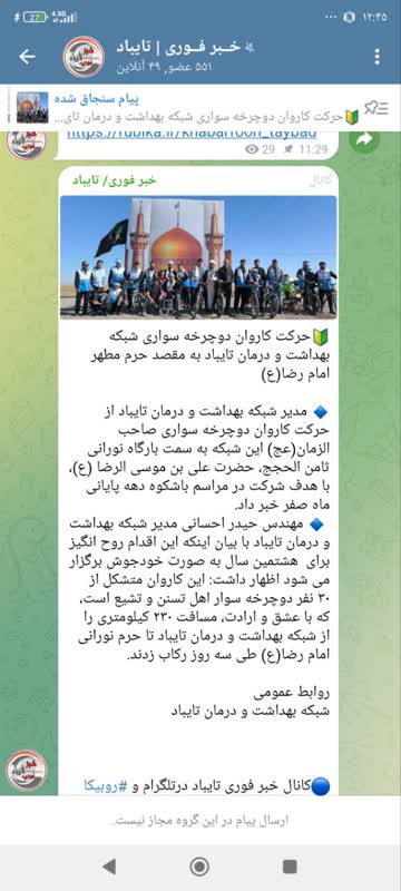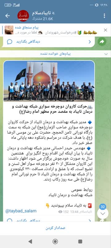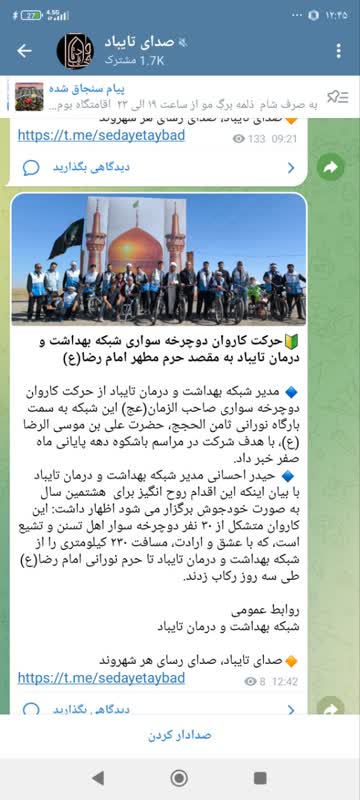 مدیر شبکه بهداشت و درمان تایباد از حرکت کاروان دوچرخه سواری صاحب الزمان(عج) این شبکه به سمت بارگاه نورانی ثامن الحجج، حضرت علی بن موسی الرضا (ع)، با هدف شرکت در مراسم باشکوه دهه پایانی ماه صفر خبر داد. مهندس حیدر احسانی در گفتگو با وب دا با بیان اینکه این اقدام روح انگیز برای هشتمین سال به صورت خودجوش برگزار می شود اظهار کرد: این کاروان متشکل از ۳۰ نفر دوچرخه سوار اهل تسنن و تشیع است، که با عشق و ارادت، مسافت ۲۳۰ کیلومتری را از شبکه بهداشت و درمان تایباد تا حرم نورانی امام رضا(ع) طی سه روز رکاب زدند.
