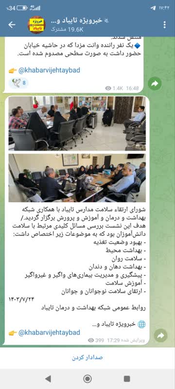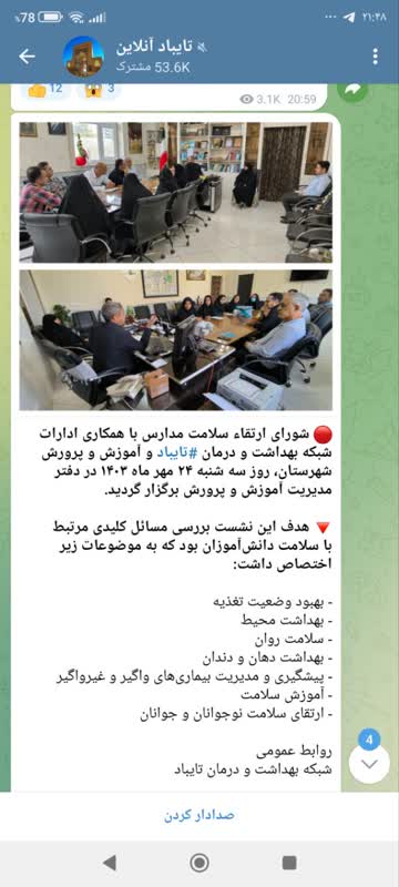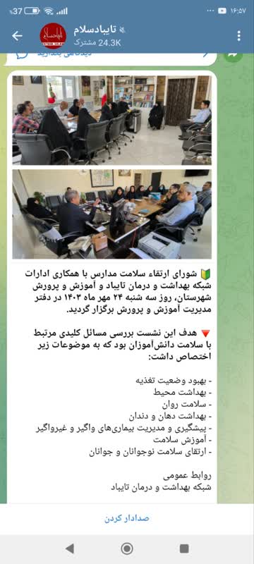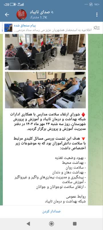 شورای ارتقاء سلامت مدارس با همکاری ادارات شبکه بهداشت و درمان تایباد و آموزش و پرورش شهرستان، روز سه شنبه ۲۴ مهر ماه ۱۴۰۳ در دفتر مدیریت آموزش و پرورش برگزار گردید.