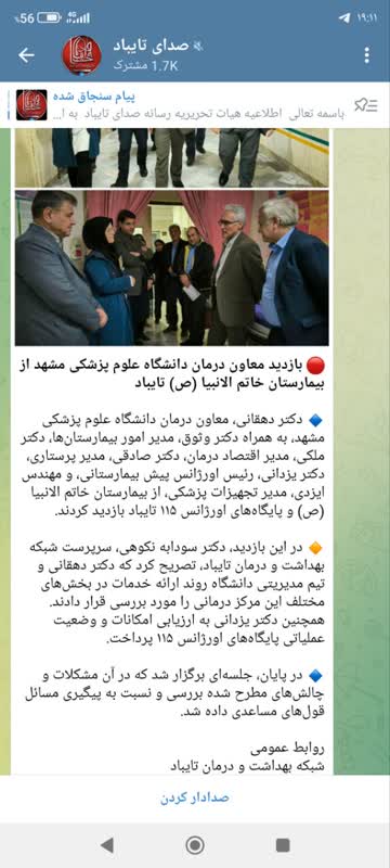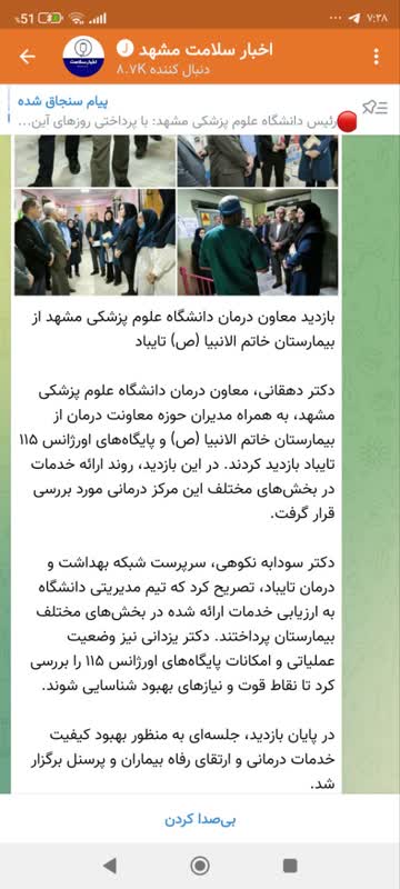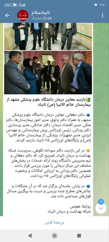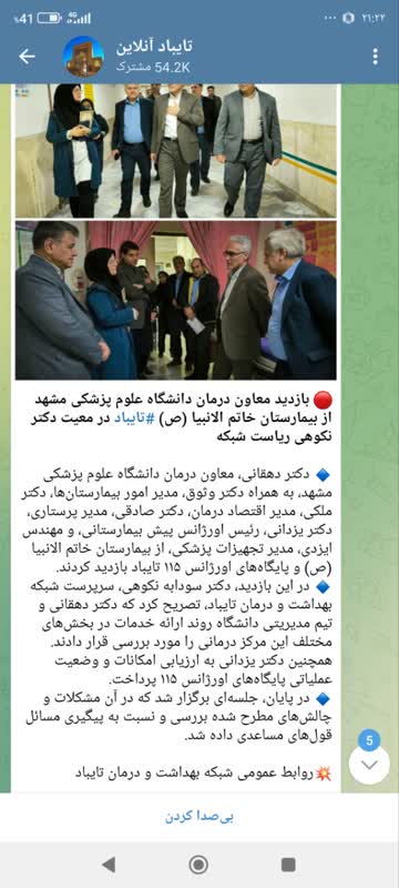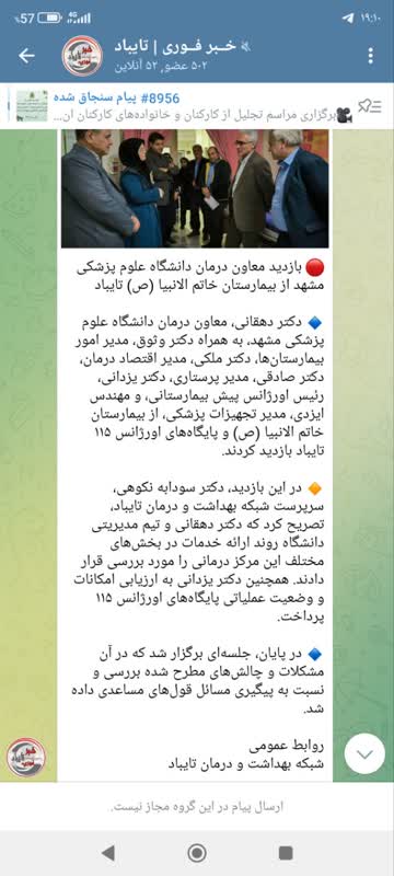 دکتر دهقانی، معاون درمان دانشگاه علوم پزشکی مشهد، به همراه دکتر وثوق، مدیر امور بیمارستان‌ها، دکتر ملکی، مدیر اقتصاد درمان، دکتر صادقی، مدیر پرستاری، دکتر یزدانی، رئیس اورژانس پیش بیمارستانی، و مهندس ایزدی، مدیر تجهیزات پزشکی، از بیمارستان خاتم الانبیا (ص) و پایگاه‌های اورژانس ۱۱۵ تایباد بازدید کردند. در این بازدید، دکتر سودابه نکوهی، سرپرست شبکه بهداشت و درمان تایباد، تصریح کرد که دکتر دهقانی و تیم مدیریتی دانشگاه روند ارائه خدمات در بخش‌های مختلف این مرکز درمانی را مورد بررسی قرار دادند. همچنین دکتر یزدانی به ارزیابی امکانات و وضعیت عملیاتی پایگاه‌های اورژانس ۱۱۵ پرداخت. در پایان، جلسه‌ای برگزار شد که در آن مشکلات و چالش‌های مطرح شده بررسی و نسبت به پیگیری مسائل قول‌های مساعدی داده شد.