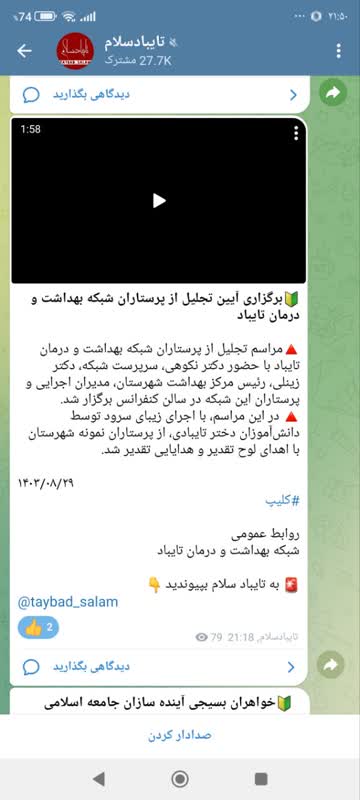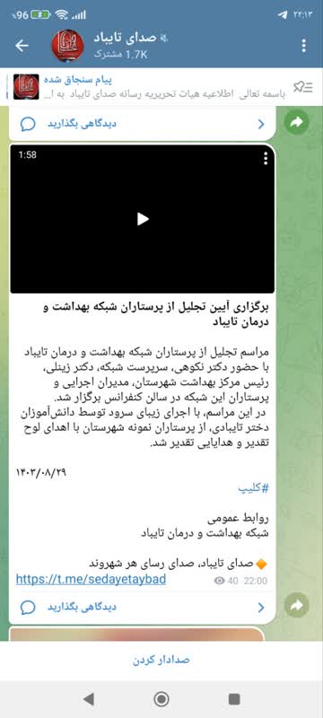 مراسم تجلیل از پرستاران شبکه بهداشت و درمان تایباد با حضور دکتر نکوهی، سرپرست شبکه، دکتر زینلی، رئیس مرکز بهداشت شهرستان، مدیران اجرایی و پرستاران این شبکه در سالن کنفرانس برگزار شد. در این مراسم، با اجرای زیبای سرود توسط دانش‌آموزان دختر تایبادی، از پرستاران نمونه شهرستان با اهدای لوح تقدیر و هدایایی تجلیل شد.