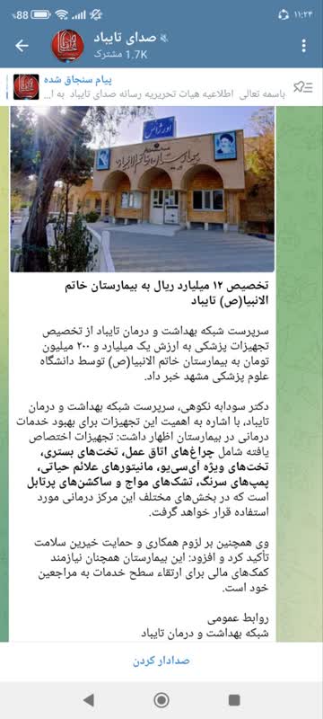 سرپرست شبکه بهداشت و درمان تایباد از تخصیص تجهیزات پزشکی به ارزش یک میلیارد و ۲۰۰ میلیون تومان به بیمارستان خاتم الانبیا(ص) توسط دانشگاه علوم پزشکی مشهد خبر داد. دکتر سودابه نکوهی، سرپرست شبکه بهداشت و درمان تایباد، با اشاره به اهمیت این تجهیزات برای بهبود خدمات درمانی در بیمارستان اظهار داشت: تجهیزات اختصاص یافته شامل چراغ‌های اتاق عمل، تخت‌های بستری، تخت‌های ویژه آی‌سی‌یو، مانیتورهای علائم حیاتی، پمپ‌های سرنگ، تشک‌های مواج و ساکشن‌های پرتابل است که در بخش‌های مختلف این مرکز درمانی مورد استفاده قرار خواهد گرفت. وی همچنین بر لزوم همکاری و حمایت خیرین سلامت تأکید کرد و افزود: این بیمارستان همچنان نیازمند کمک‌های مالی برای ارتقاء سطح خدمات به مراجعین خود است.