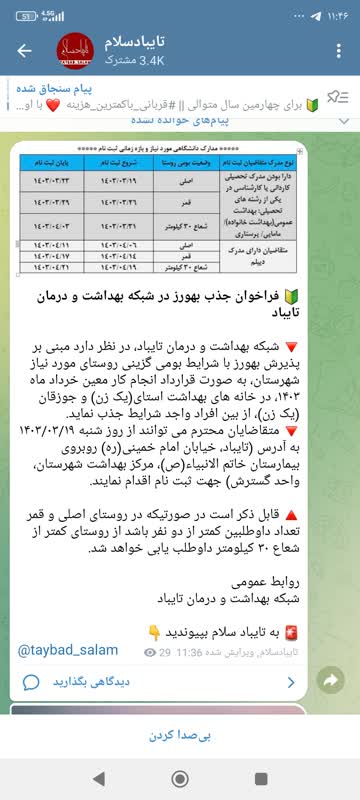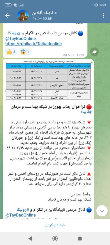 شبکه بهداشت و درمان تایباد، در نظر دارد مبنی بر پذیرش بهورز با شرایط بومی گزینی روستای مورد نیاز شهرستان، به صورت قرارداد انجام کار معین خرداد ماه ۱۴۰۳، در خانه های بهداشت استای(یک زن) و جوزقان (یک زن)، از بین افراد واجد شرایط جذب نماید.