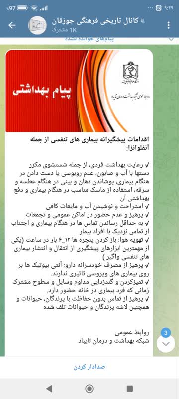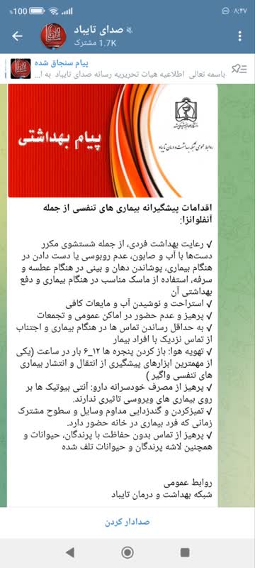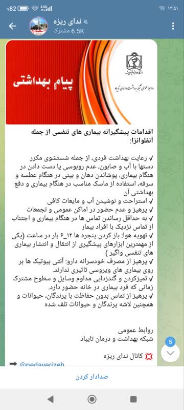 √ تهویه هوا: باز کردن پنجره ها ۱۲_۶ بار در ساعت (یکی از مهمترین ابزارهای پیشگیری از انتقال و انتشار بیماری های تنفسی واگیر )