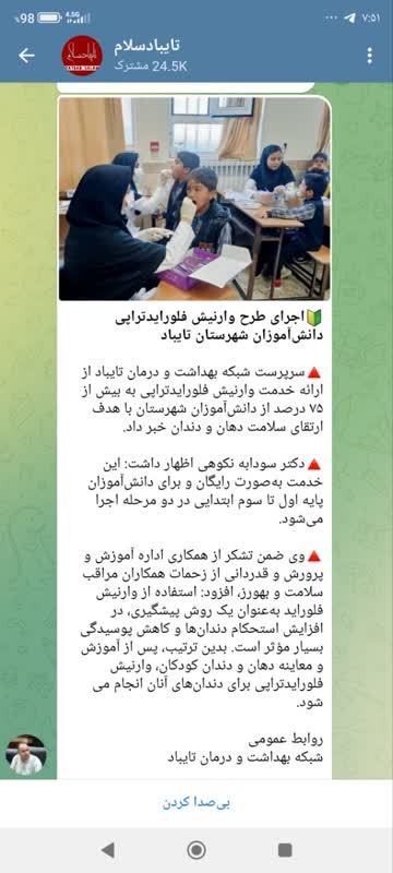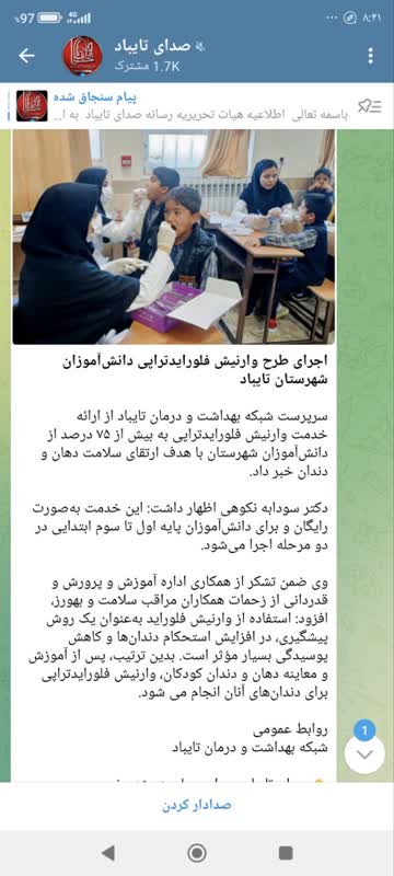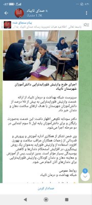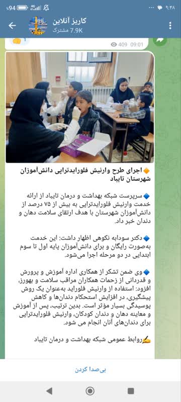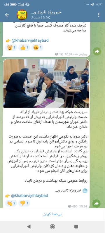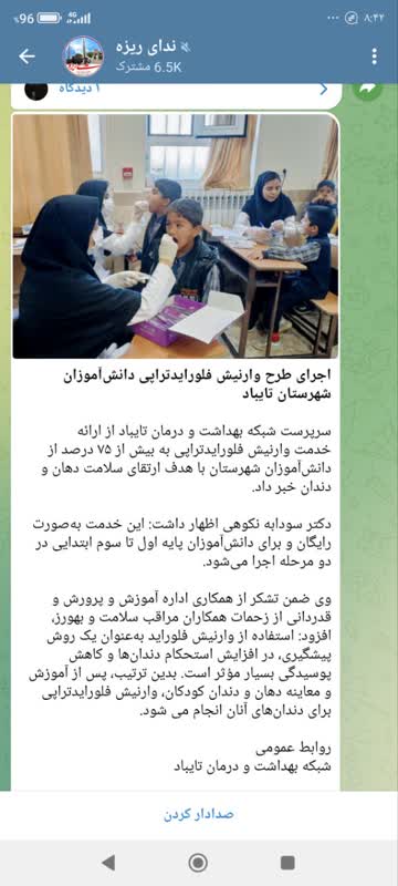 سرپرست شبکه بهداشت و درمان تایباد از ارائه خدمت وارنیش فلورایدتراپی به بیش از ۷۵ درصد از دانشآموزان شهرستان با هدف ارتقای سلامت دهان و دندان خبر داد. دکتر سودابه نکوهی اظهار داشت: این خدمت بهصورت رایگان و برای دانشآموزان پایه اول تا سوم ابتدایی در دو مرحله اجرا میشود. وی ضمن تشکر از همکاری اداره آموزش و پرورش و قدردانی از زحمات همکاران مراقب سلامت و بهورز، افزود: استفاده از وارنیش فلوراید بهعنوان یک روش پیشگیری، در افزایش استحکام دندانها و کاهش پوسیدگی بسیار مؤثر است. بدین ترتیب، پس از آموزش و معاینه دهان و دندان کودکان، وارنیش فلورایدتراپی برای دندانهای آنان انجام می شود.