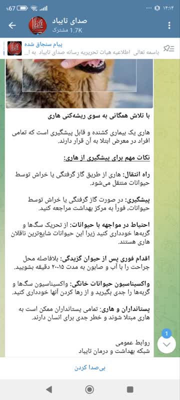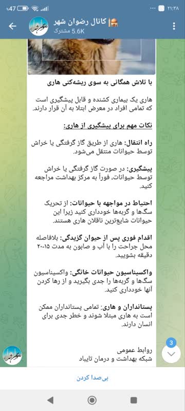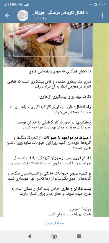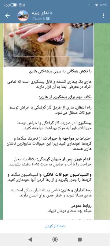 هاری یک بیماری کشنده و قابل پیشگیری است که تمامی افراد در معرض ابتلا به آن قرار دارند. نکات مهم برای پیشگیری از هاری: راه انتقال: هاری از طریق گاز گرفتگی یا خراش توسط حیوانات منتقل میشود. پیشگیری: در صورت گاز گرفتگی یا خراش توسط حیوانات، فوراً به مرکز بهداشت مراجعه کنید. احتیاط در مواجهه با حیوانات: از تحریک سگها و گربهها خودداری کنید زیرا این حیوانات شایعترین ناقلان هاری هستند. اقدام فوری پس از حیوان گزیدگی: بلافاصله محل جراحت را با آب و صابون به مدت ۱۵-۲۰ دقیقه بشویید. واکسیناسیون حیوانات خانگی: واکسیناسیون سگها و گربهها را جدی بگیرید و از رها کردن آنها خودداری کنید. پستانداران و هاری: تمامی پستانداران ممکن است به هاری مبتلا شوند و خطر جدی برای انسان دارند.