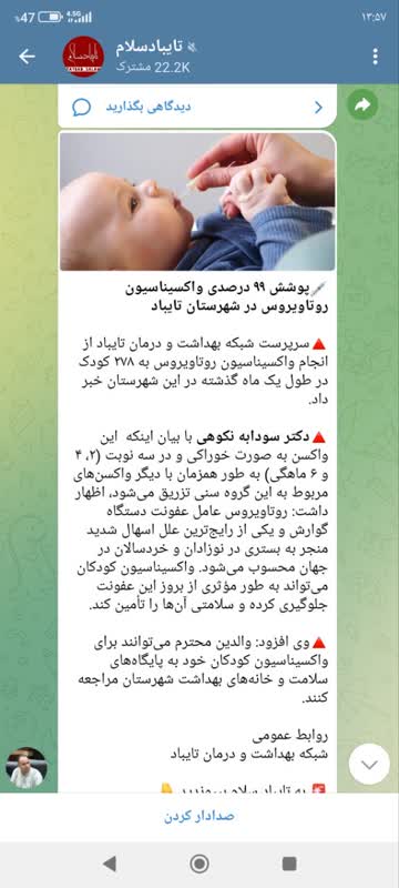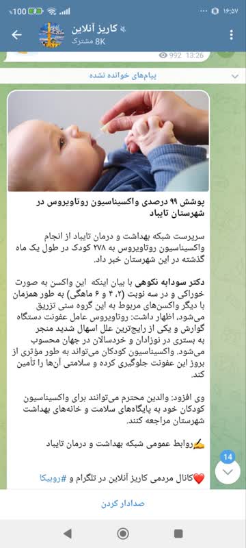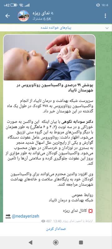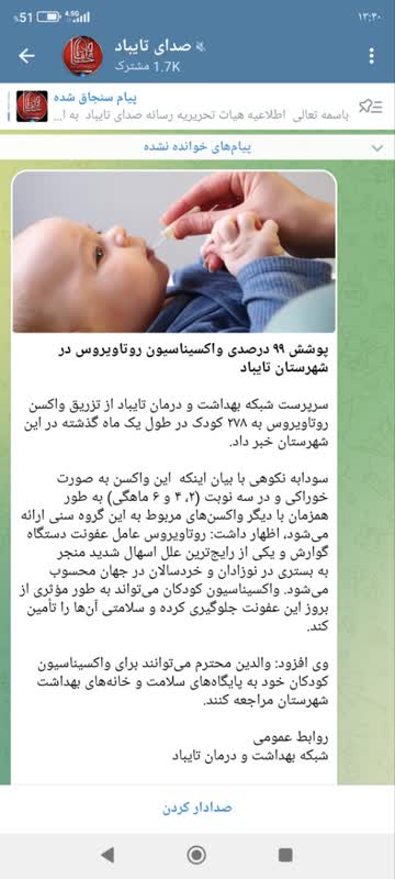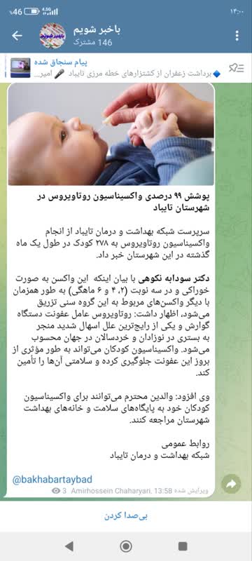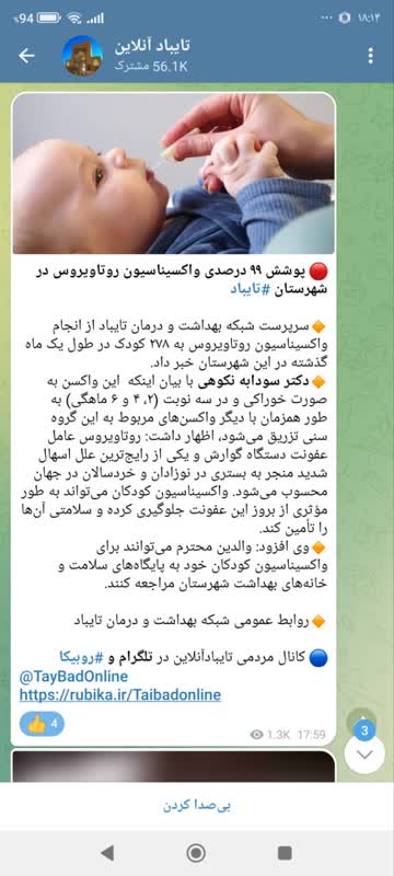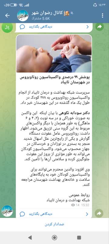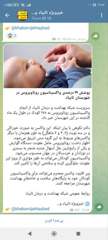 سرپرست شبکه بهداشت و درمان تایباد از انجام واکسیناسیون روتاویروس به ۲۷۸ کودک در طول یک ماه گذشته در این شهرستان خبر داد. دکتر سودابه نکوهی در گفتگو با وب دا با بیان اینکه این واکسن به صورت خوراکی و در سه نوبت (۲، ۴ و ۶ ماهگی) به طور همزمان با دیگر واکسنهای مربوط به این گروه سنی تزریق میشود، اظهار کرد: روتاویروس عامل عفونت دستگاه گوارش و یکی از رایجترین علل اسهال شدید منجر به بستری در نوزادان و خردسالان در جهان محسوب میشود. واکسیناسیون کودکان میتواند به طور مؤثری از بروز این عفونت جلوگیری کرده و سلامتی آنها را تأمین کند. وی افزود: والدین میتوانند برای واکسیناسیون کودکان خود به پایگاه های سلامت و خانههای بهداشت شهرستان مراجعه کنند.
