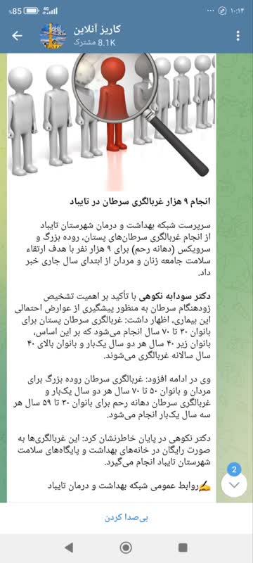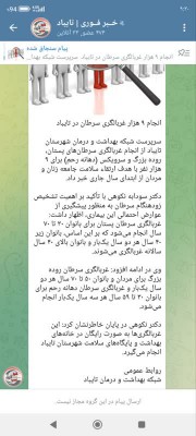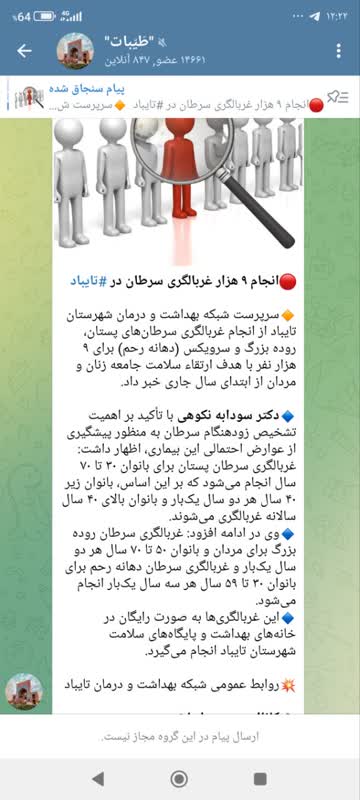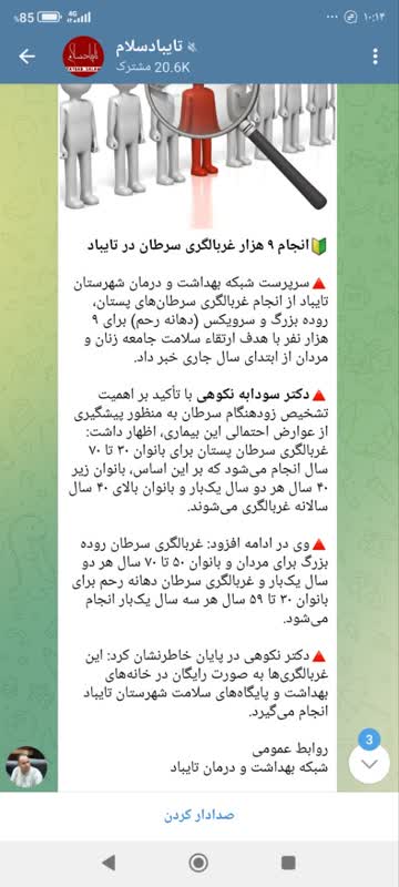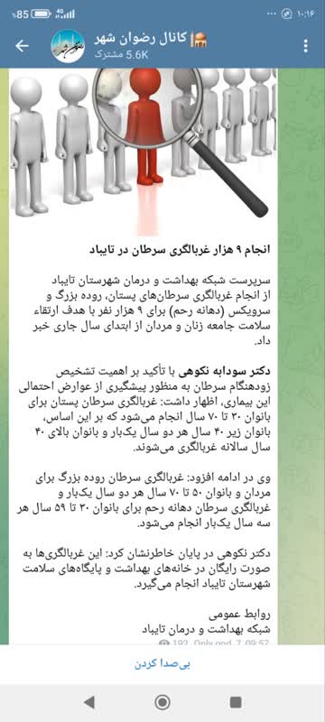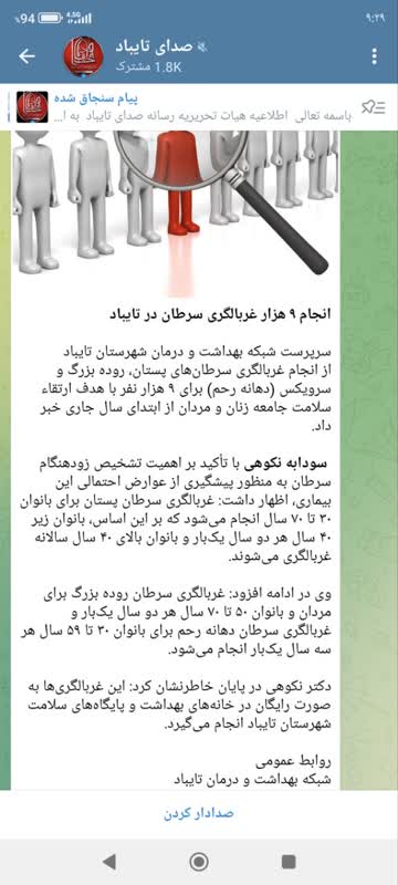 سرپرست شبکه بهداشت و درمان شهرستان تایباد از انجام غربالگری سرطانهای پستان، روده بزرگ و سرویکس (دهانه رحم) برای ۹ هزار نفر با هدف ارتقاء سلامت جامعه زنان و مردان از ابتدای سال جاری خبر داد. دکتر سودابه نکوهی با تأکید بر اهمیت تشخیص زودهنگام سرطان به منظور پیشگیری از عوارض احتمالی این بیماری، اظهار داشت: غربالگری سرطان پستان برای بانوان ۳۰ تا ۷۰ سال انجام میشود که بر این اساس، بانوان زیر ۴۰ سال هر دو سال یکبار و بانوان بالای ۴۰ سال سالانه غربالگری میشوند. وی در ادامه افزود: غربالگری سرطان روده بزرگ برای مردان و بانوان ۵۰ تا ۷۰ سال هر دو سال یکبار و غربالگری سرطان دهانه رحم برای بانوان ۳۰ تا ۵۹ سال هر سه سال یکبار انجام میشود. دکتر نکوهی در پایان خاطرنشان کرد: این غربالگریها به صورت رایگان در خانههای بهداشت و پایگاههای سلامت شهرستان تایباد انجام میگیرد