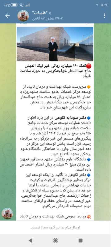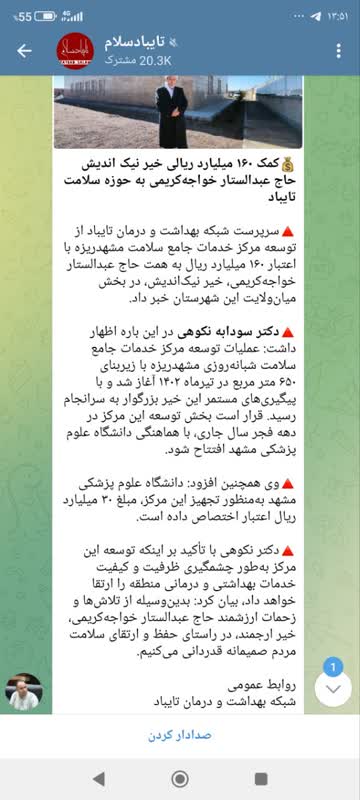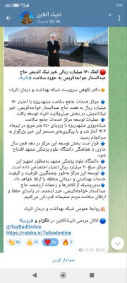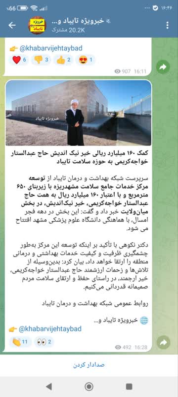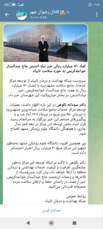 سرپرست شبکه بهداشت و درمان تایباد از توسعه مرکز خدمات جامع سلامت مشهدریزه با اعتبار ۱۶۰ میلیارد ریال به همت حاج عبدالستار خواجهکریمی، خیر نیکاندیش، در بخش میانولایت این شهرستان خبر داد.