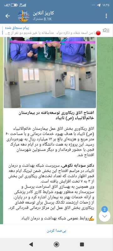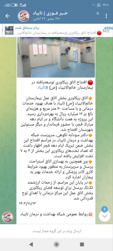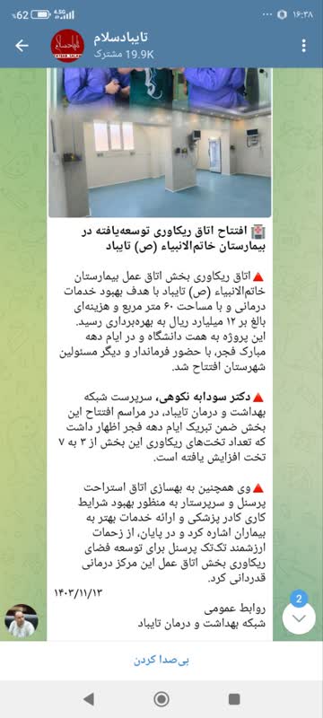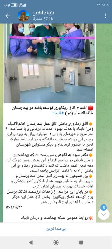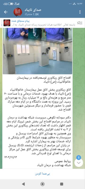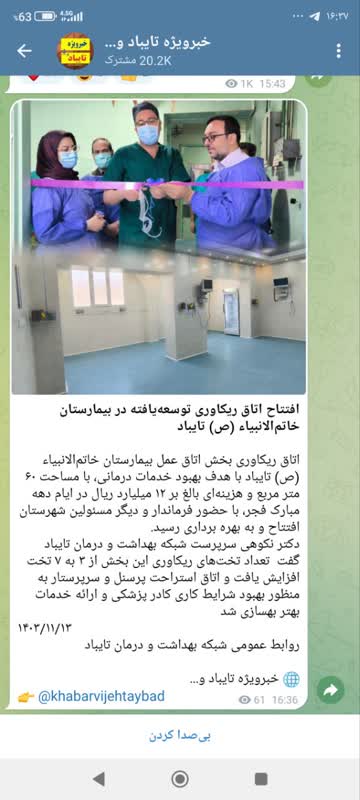 اتاق ریکاوری بخش اتاق عمل بیمارستان خاتمالانبیاء (ص) تایباد با هدف بهبود خدمات درمانی و با مساحت ۶۰ متر مربع و هزینهای بالغ بر ۱۲ میلیارد ریال به بهرهبرداری رسید. این پروژه به همت دانشگاه و در ایام دهه مبارک فجر، با حضور فرماندار و دیگر مسئولین شهرستان افتتاح شد. دکتر سودابه نکوهی، سرپرست شبکه بهداشت و درمان تایباد، در مراسم افتتاح این بخش ضمن تبریک ایام دهه فجر اظهار داشت که تعداد تختهای ریکاوری این بخش از ۳ به ۷ تخت افزایش یافته است. وی همچنین به بهسازی اتاق استراحت پرسنل و سرپرستار به منظور بهبود شرایط کاری کادر پزشکی و ارائه خدمات بهتر به بیماران اشاره کرد. در پایان این مراسم، از زحمات ارزشمند تکتک پرسنل برای توسعه فضای ریکاوری بخش اتاق عمل این مرکز درمانی با اهدای لوح قدردانی شد.
