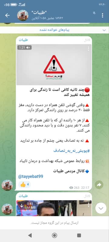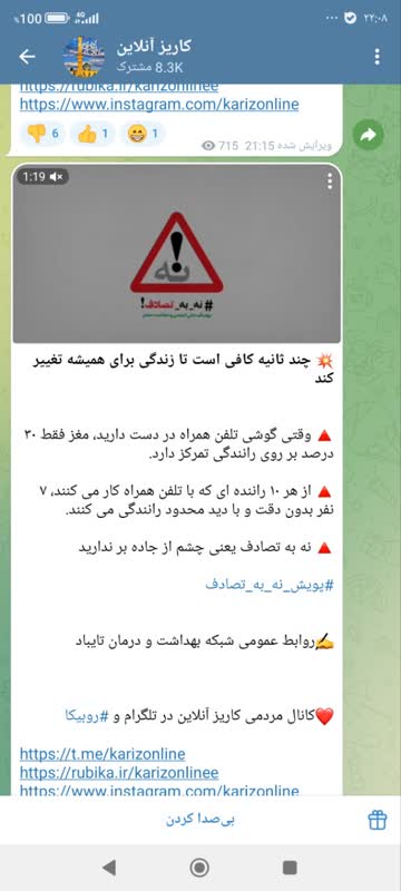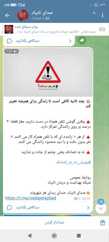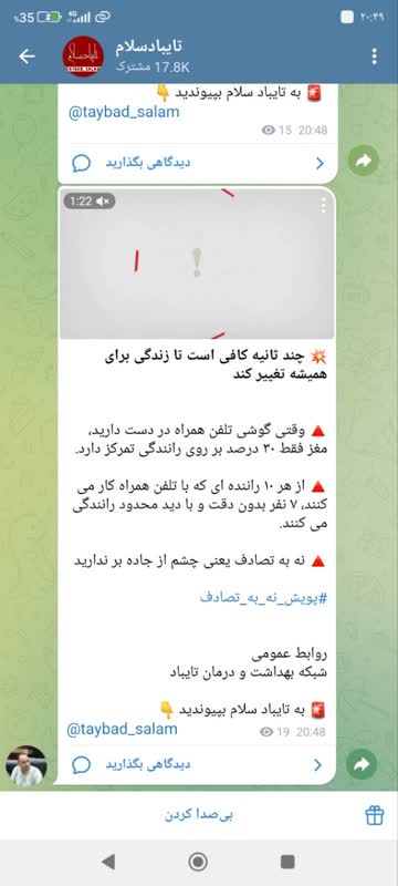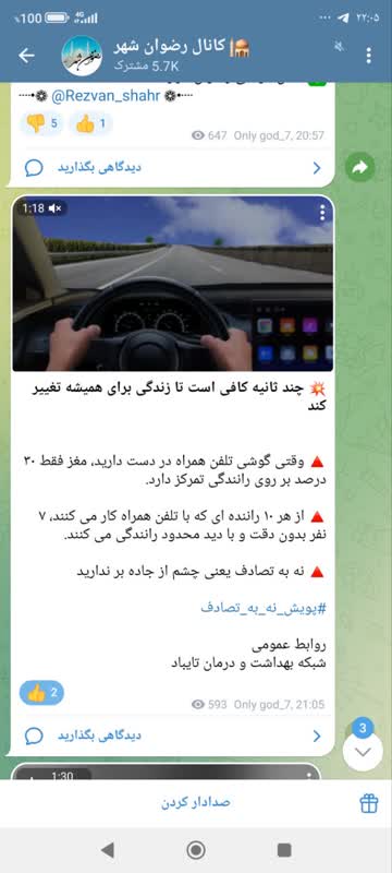 MUMS انعکاس عملکرد شبكه بهداشت و درمان تايباد 08 اسفند 1403 بازدید: 36 امتیاز: ( 0 Rating ) (کمپین نه به تصادفات) 💥 چند ثانیه کافی است تا زندگی برای همیشه تغییر کند امتیاز کاربران لطفا رای دهید رای 1 رای 2 رای 3 رای 4 رای 5 انعکاس رسانه ای شبکه های اجتماعی کلیپ انعکاس رسانه ای شبکه های اجتماعی کلیپ انعکاس رسانه ای وقتی گوشی تلفن همراه در دست دارید، مغز فقط ۳۰ درصد بر روی رانندگی تمرکز دارد. از هر ۱۰ راننده ای که با تلفن همراه کار می کنند، ۷ نفر بدون دقت و با دید محدود رانندگی می کنند. نه به تصادف یعنی چشم از جاده بر ندارید شبکه های اجتماعی کلیپ