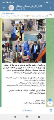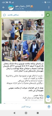 در راستای برنامه سلامت نوروزی و ماه مبارک رمضان (از تاریخ ۱۱ اسفند ۱۴۰۳ تا ۱۵ فروردین ۱۴۰۴)، بازرسان بهداشت محیط و حرفهای شبکه بهداشت و درمان شهرستان بازدیدهای زیر را انجام دادند: