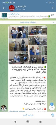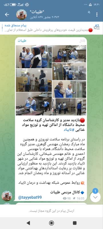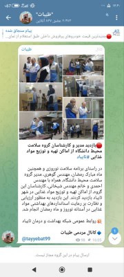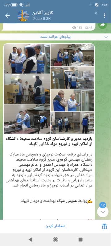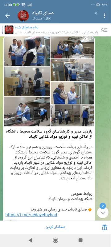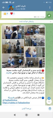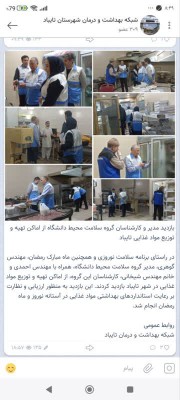 در راستای برنامه سلامت نوروزی و همچنین ماه مبارک رمضان، مهندس گوهری، مدیر گروه سلامت محیط دانشگاه، همراه با مهندس احمدی و خانم مهندس شیخانی، کارشناسان این گروه، از اماکن تهیه و توزیع مواد غذایی در شهر تایباد بازدید کردند. این بازدید به منظور ارزیابی و نظارت بر رعایت استانداردهای بهداشتی مواد غذایی در آستانه نوروز و ماه رمضان انجام شد.