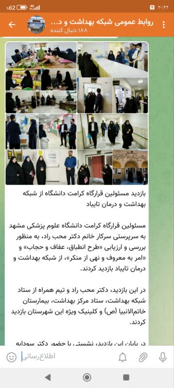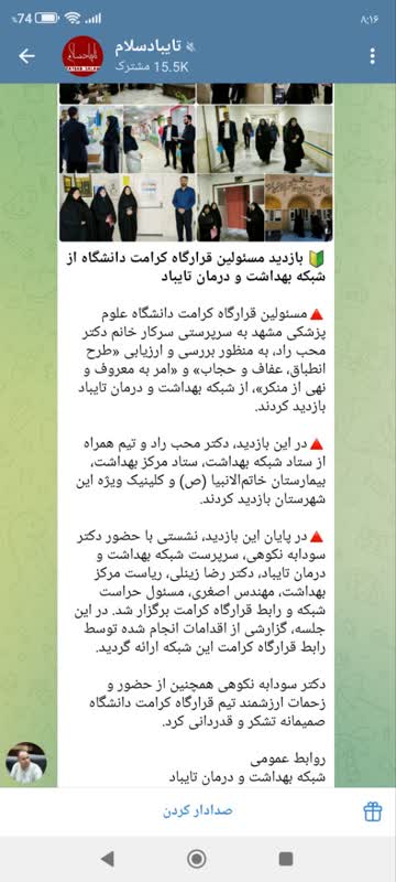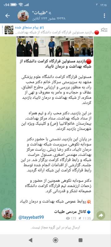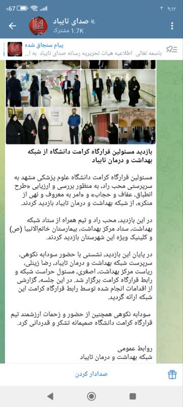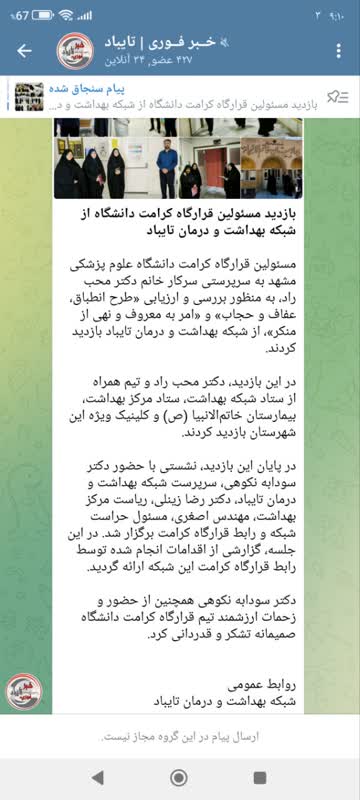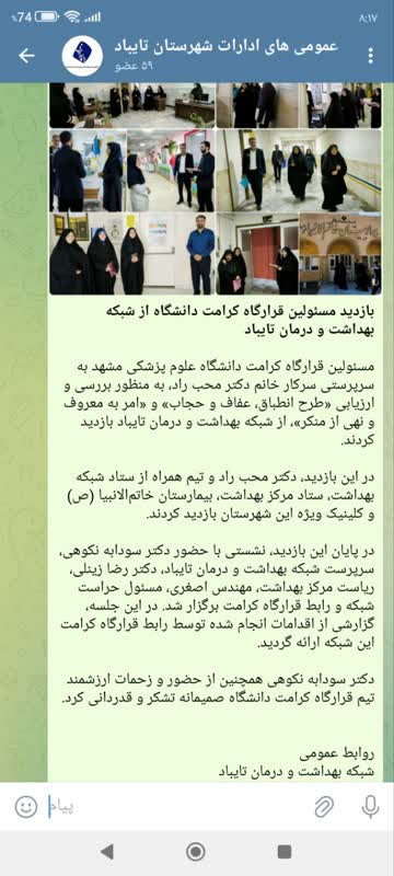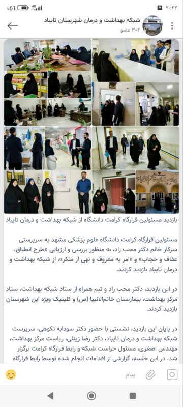 بازدید مسئولین قرارگاه کرامت دانشگاه از شبکه بهداشت و درمان تایباد مسئولین قرارگاه کرامت دانشگاه علوم پزشکی مشهد به سرپرستی سرکار خانم دکتر محب راد، به منظور بررسی و ارزیابی «طرح انطباق، عفاف و حجاب» و «امر به معروف و نهی از منکر»، از شبکه بهداشت و درمان تایباد بازدید کردند.