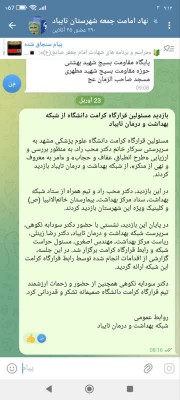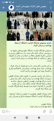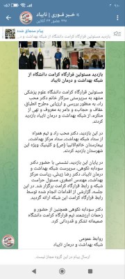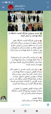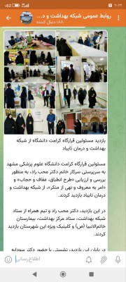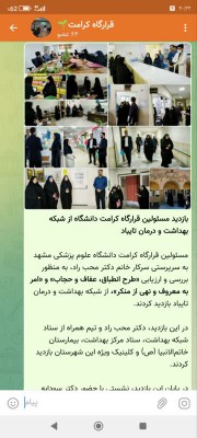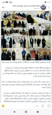 در پایان این بازدید، نشستی با حضور دکتر سودابه نکوهی، سرپرست شبکه بهداشت و درمان تایباد، دکتر رضا زینلی، ریاست مرکز بهداشت، مهندس اصغری، مسئول حراست شبکه و رابط قرارگاه کرامت برگزار شد. در این جلسه، گزارشی از اقدامات انجام شده توسط رابط قرارگاه کرامت این شبکه ارائه گردید.