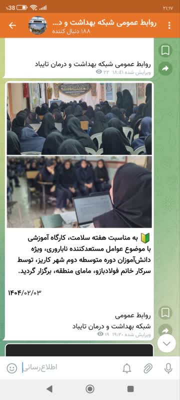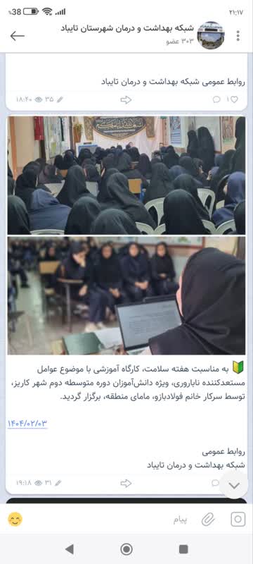 MUMS انعکاس عملکرد شبكه بهداشت و درمان تايباد 03 ارديبهشت 1404 بازدید: 34 امتیاز: ( 0 Rating ) به مناسبت هفته سلامت، کارگاه آموزشی با موضوع عوامل مستعدکننده ناباروری ویژه دانش آموزان برگزار شد امتیاز کاربران لطفا رای دهید رای 1 رای 2 رای 3 رای 4 رای 5 انعکاس رسانه ای شبکه های اجتماعی انعکاس رسانه ای شبکه های اجتماعی انعکاس رسانه ای به مناسبت هفته سلامت، کارگاه آموزشی با موضوع عوامل مستعدکننده ناباروری، ویژه دانشآموزان دوره متوسطه دوم شهر کاریز، توسط سرکار خانم فولادبازو، مامای منطقه، برگزار گردید. شبکه های اجتماعی
