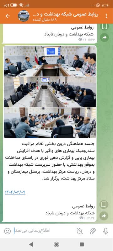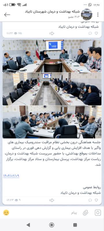 جلسه هماهنگی درون بخشی نظام مراقبت سندرومیک بیماری های واگیر با هدف افزایش بیماری یابی و گزارش دهی فوری در راستای مداخلات بموقع بهداشتی، با حضور سرپرست شبکه بهداشت و درمان، ریاست مرکز بهداشت، پرسنل بیمارستان و ستاد مرکز بهداشت، برگزار شد.