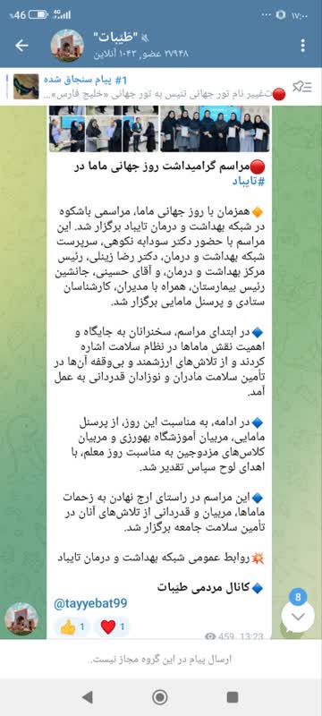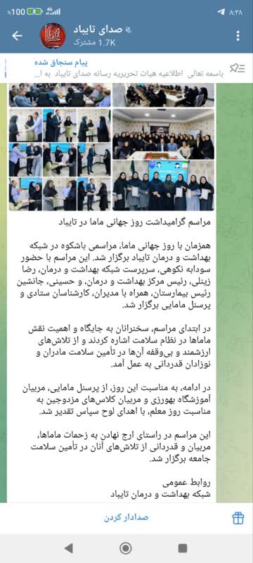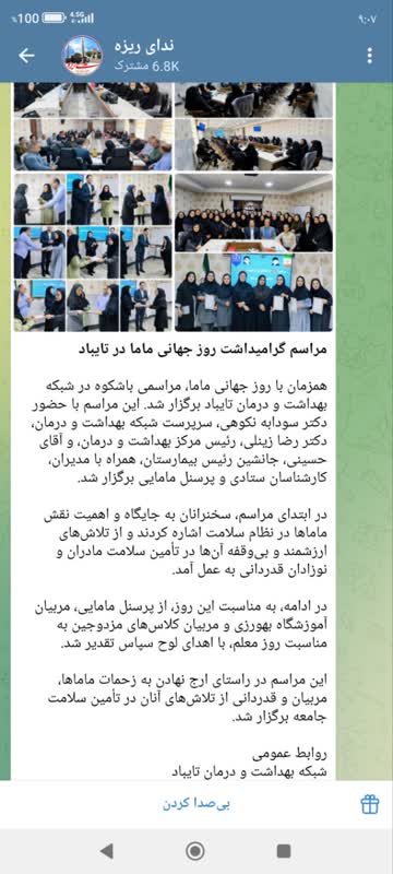 همزمان با روز جهانی ماما، مراسمی باشکوه در شبکه بهداشت و درمان تایباد برگزار شد. این مراسم با حضور دکتر سودابه نکوهی، سرپرست شبکه بهداشت و درمان، دکتر رضا زینلی، رئیس مرکز بهداشت و درمان، و آقای حسینی، جانشین رئیس بیمارستان، همراه با مدیران، کارشناسان ستادی و پرسنل مامایی برگزار شد.