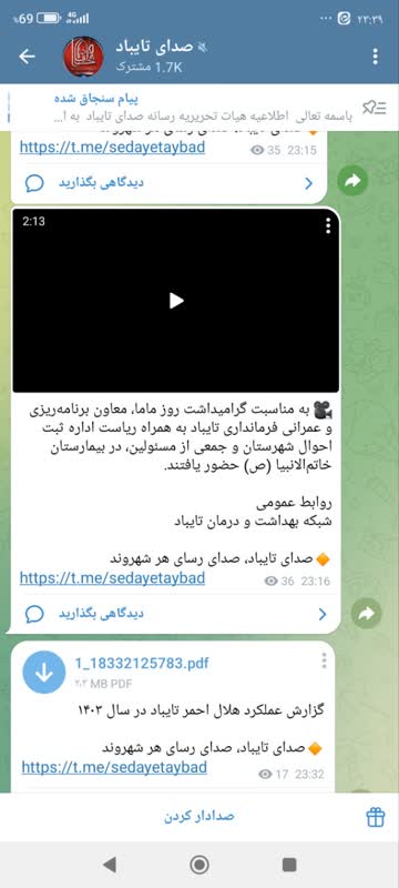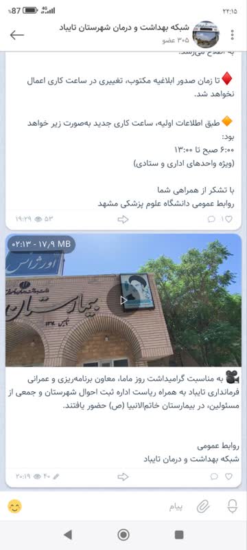 MUMS انعکاس عملکرد شبكه بهداشت و درمان تايباد 17 ارديبهشت 1404 بازدید: 27 امتیاز: ( 0 Rating ) بازدید معاون فرماندار از بیمارستان تایباد به مناسبت روز ماما امتیاز کاربران لطفا رای دهید رای 1 رای 2 رای 3 رای 4 رای 5 انعکاس رسانه ای شبکه های اجتماعی کلیپ انعکاس رسانه ای شبکه های اجتماعی کلیپ انعکاس رسانه ای به مناسبت گرامیداشت روز ماما، معاون برنامهریزی و عمرانی فرمانداری تایباد به همراه ریاست اداره ثبت احوال شهرستان و جمعی از مسئولین، در بیمارستان خاتمالانبیا (ص) حضور یافتند. شبکه های اجتماعی کلیپ