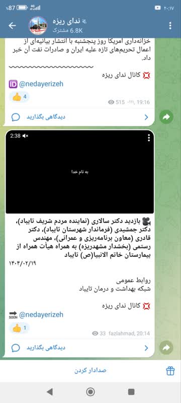 MUMS انعکاس عملکرد شبكه بهداشت و درمان تايباد 19 ارديبهشت 1404 بازدید: 27 امتیاز: ( 0 Rating ) بازدید دکتر سالاری نماینده شهرستان از بیمارستان خاتم الانبیاء تایباد امتیاز کاربران لطفا رای دهید رای 1 رای 2 رای 3 رای 4 رای 5 انعکاس رسانه ای شبکه های اجتماعی کلیپ انعکاس رسانه ای شبکه های اجتماعی کلیپ انعکاس رسانه ای بازدید دکتر سالاری (نماینده مردم شریف تایباد)، دکتر جمشیدی (فرماندار شهرستان تایباد)، دکتر قادری (معاون برنامهریزی و عمرانی)، مهندس رستمی (بخشدار مشهدریزه) به همراه هیأت همراه از بیمارستان خاتم الانبیا(ص) تایباد شبکه های اجتماعی کلیپ
