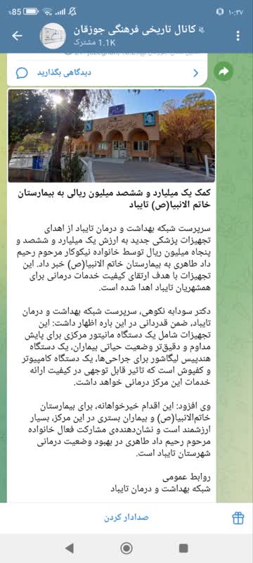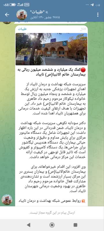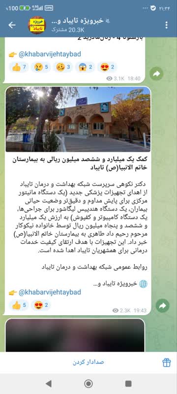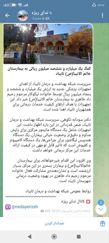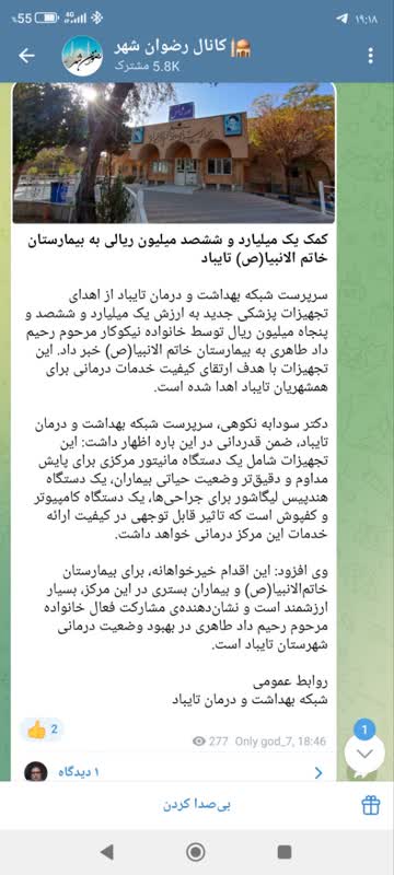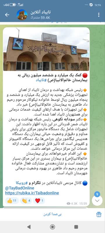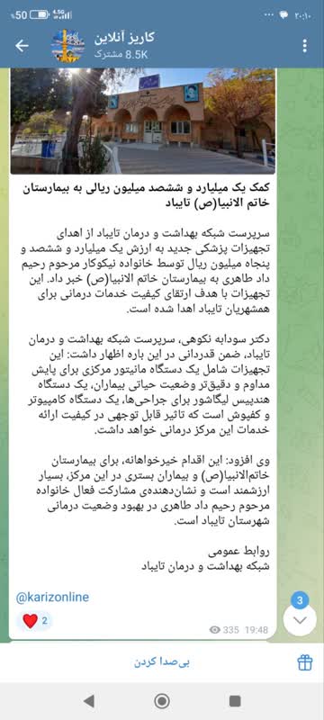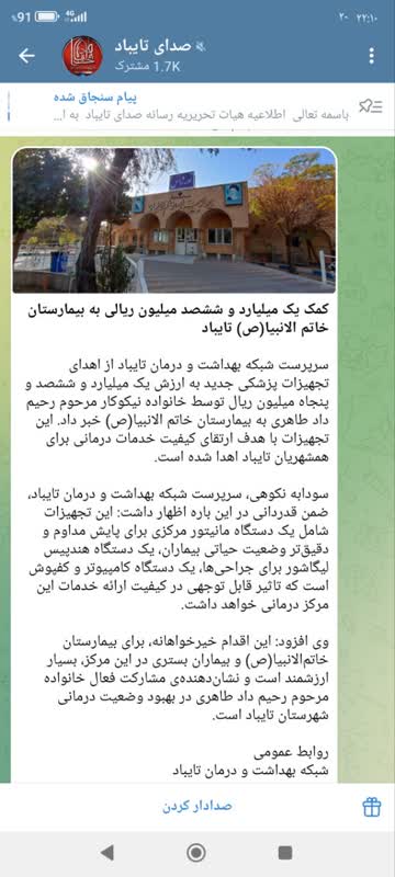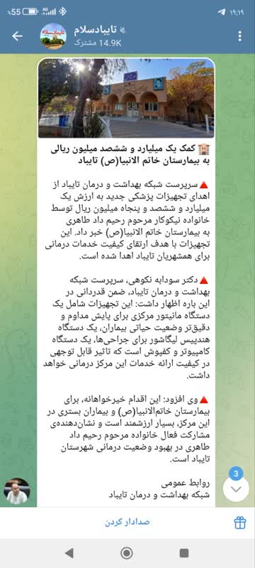 کمک یک میلیارد و ششصد میلیون ریالی به بیمارستان خاتم الانبیا(ص) تایباد