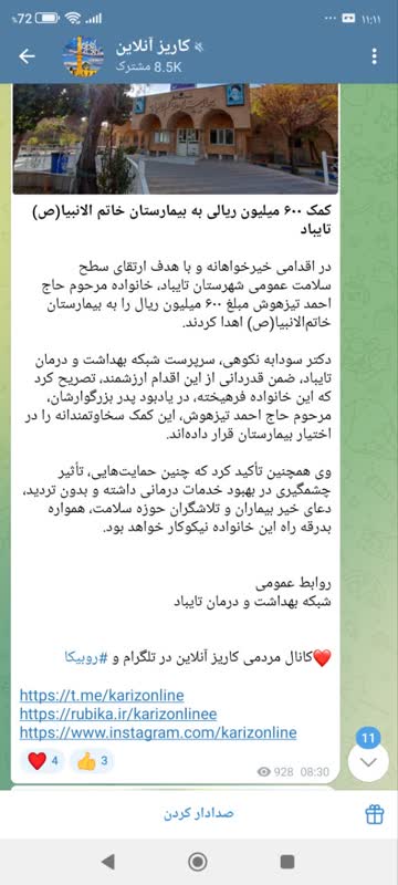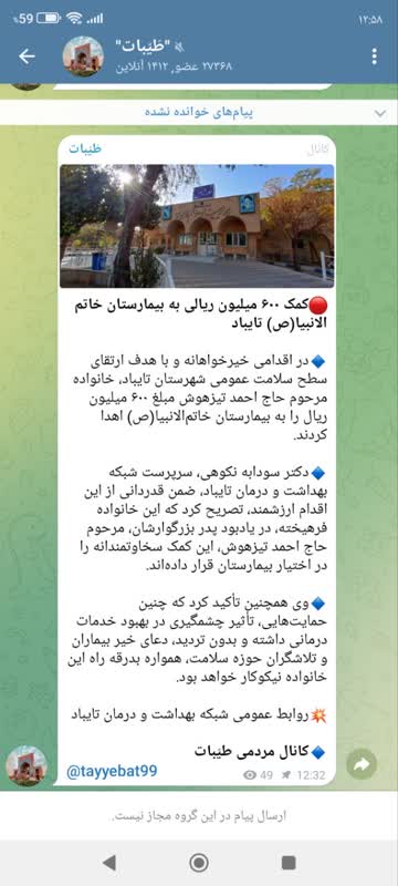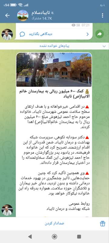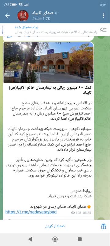 در اقدامی خیرخواهانه و با هدف ارتقای سطح سلامت عمومی شهرستان تایباد، خانواده مرحوم حاج احمد تیزهوش مبلغ ۶۰۰ میلیون ریال را به بیمارستان خاتمالانبیا(ص) اهدا کردند.