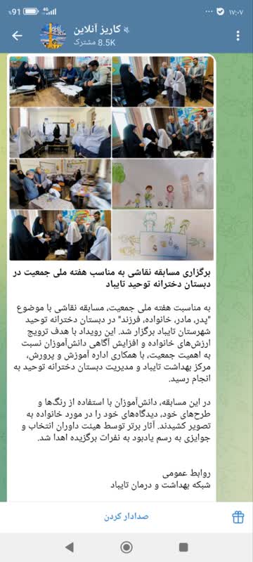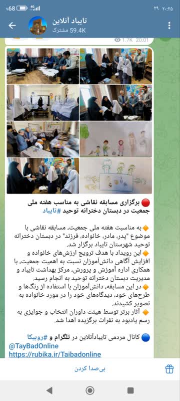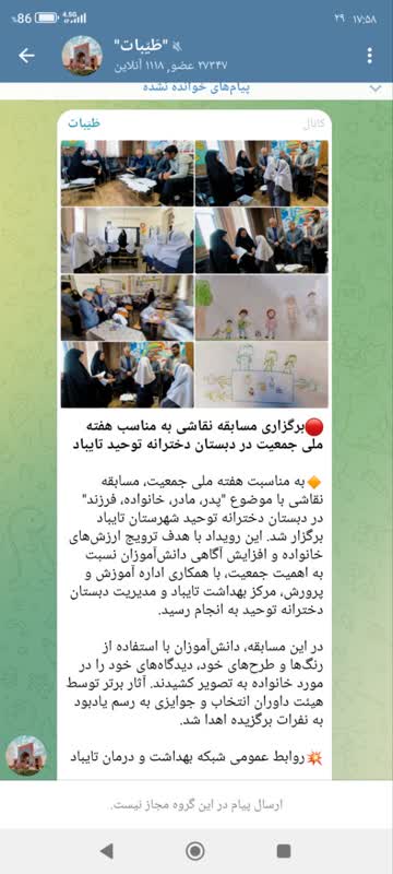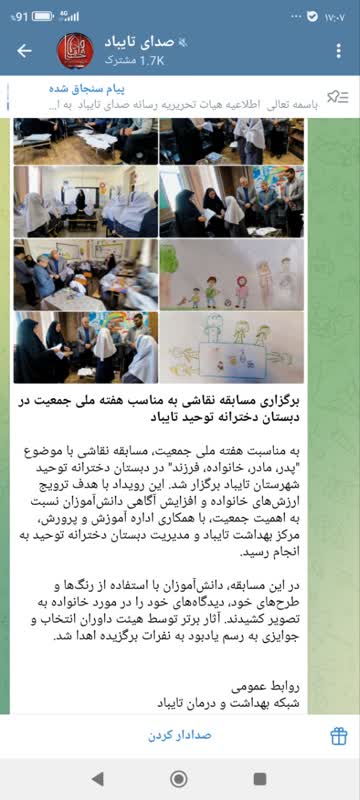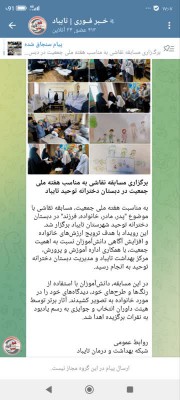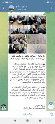 به مناسبت هفته ملی جمعیت، مسابقه نقاشی با موضوع "پدر، مادر، خانواده، فرزند" در دبستان دخترانه توحید شهرستان تایباد برگزار شد. این رویداد با هدف ترویج ارزشهای خانواده و افزایش آگاهی دانشآموزان نسبت به اهمیت جمعیت، با همکاری اداره آموزش و پرورش، مرکز بهداشت تایباد و مدیریت دبستان دخترانه توحید به انجام رسید.