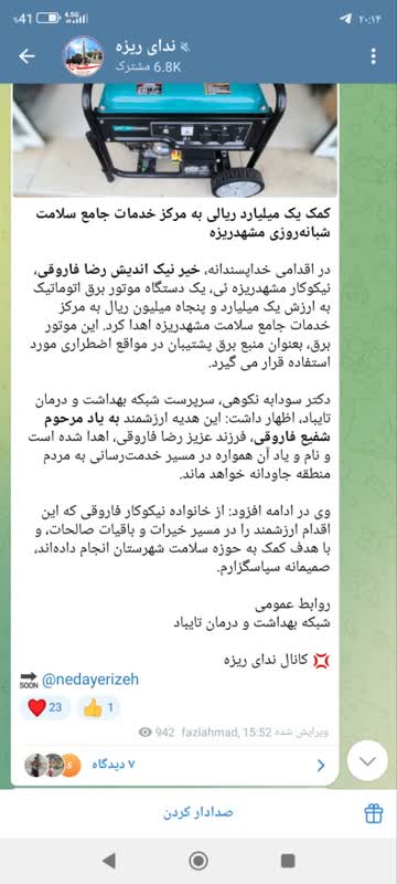 در اقدامی خداپسندانه، خیر نیک اندیش رضا فاروقی، نیکوکار مشهدریزه ئی، یک دستگاه موتور برق اتوماتیک به ارزش یک میلیارد و پنجاه میلیون ریال به مرکز خدمات جامع سلامت مشهدریزه اهدا کرد. این موتور برق، بعنوان منبع برق پشتیبان در مواقع اضطراری مورد استفاده قرار می گیرد.