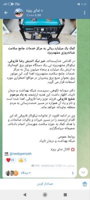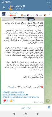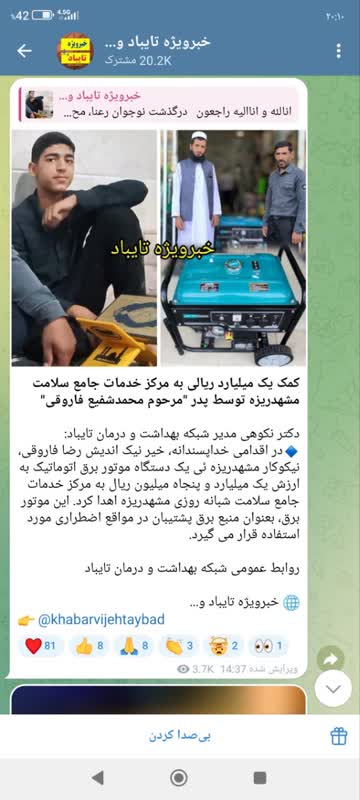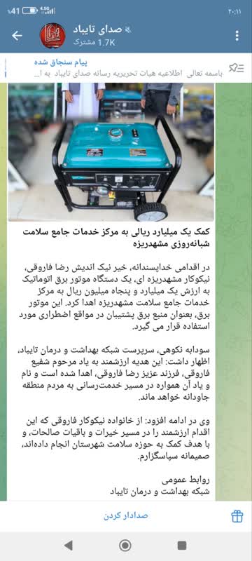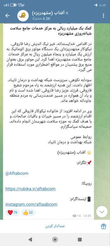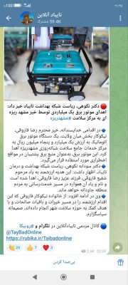 دکتر سودابه نکوهی، سرپرست شبکه بهداشت و درمان تایباد، اظهار داشت: این هدیه ارزشمند به یاد مرحوم شفیع فاروقی، فرزند عزیز رضا فاروقی، اهدا شده است و نام و یاد آن همواره در مسیر خدمترسانی به مردم منطقه جاودانه خواهد ماند.