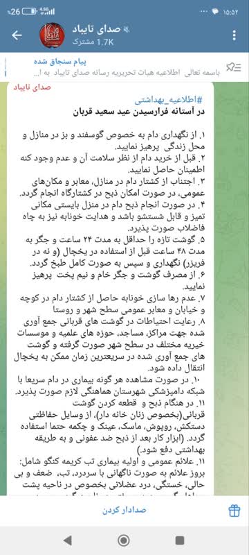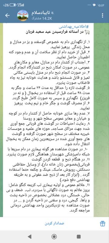 ۸. رعایت احتیاطات در گوشت های قربانی جمع آوری شده جهت مراکز، مساجد، حوزه های علمیه و موسسات خیریه مختلف در سطح شهر صورت گرفته و گوشت های جمع آوری شده در سریعترین زمان ممکن به یخچال انتقال داده شود.