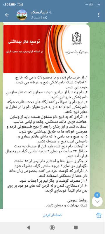 ۳. ذبح دام را صرفأ در کشتارگاه های تحت نظارت شبکه دامپزشکی انجام دهند و به هیچ عنوان دام را در منازل و معابر ذبح نکنند.