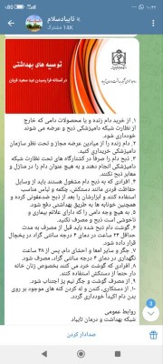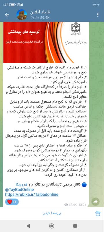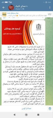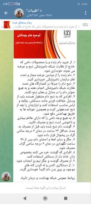 ۶. گوشت دام ذبح شده باید قبل از مصرف به مدت حداقل ۲۴ ساعت در دمای ۴ درجه سانتی گراد در یخچال قرار داده شود.