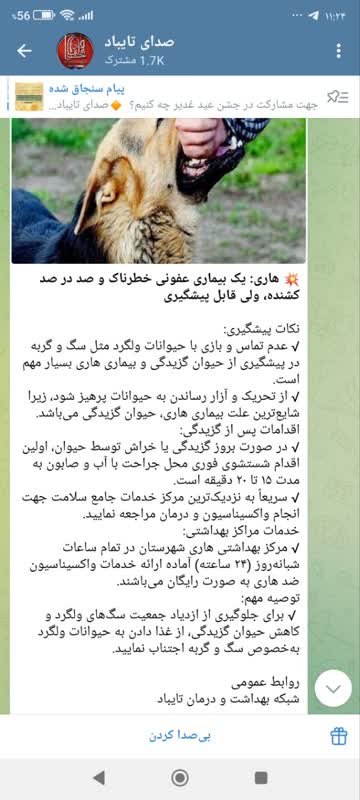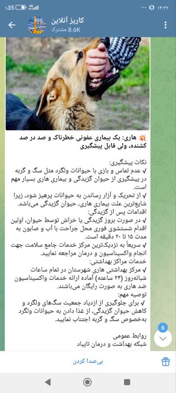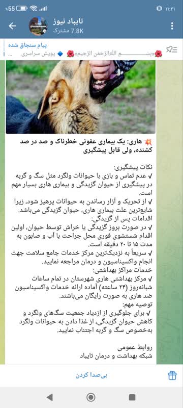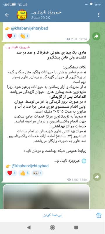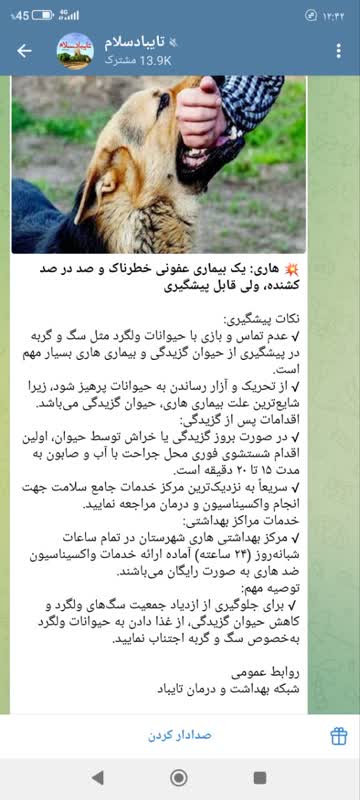 √ مرکز بهداشتی هاری شهرستان در تمام ساعات شبانهروز (۲۴ ساعته) آماده ارائه خدمات واکسیناسیون ضد هاری به صورت رایگان میباشند. توصیه مهم: