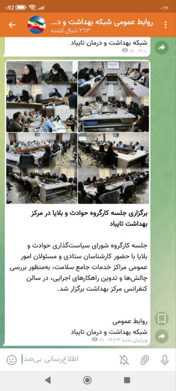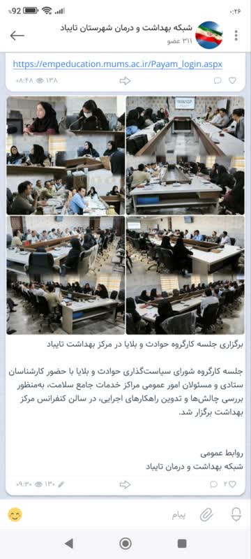 MUMS انعکاس عملکرد شبكه بهداشت و درمان تايباد 05 تیر 1404 بازدید: 4 امتیاز: ( 0 Rating ) برگزاری جلسه کارگروه حوادث و بلایا در مرکز بهداشت تایباد امتیاز کاربران لطفا رای دهید رای 1 رای 2 رای 3 رای 4 رای 5 انعکاس رسانه ای شبکه های اجتماعی انعکاس رسانه ای شبکه های اجتماعی انعکاس رسانه ای جلسه کارگروه شورای سیاستگذاری حوادث و بلایا با حضور کارشناسان ستادی و مسئولان امور عمومی مراکز خدمات جامع سلامت، بهمنظور بررسی چالشها و تدوین راهکارهای اجرایی، در سالن کنفرانس مرکز بهداشت برگزار شد. شبکه های اجتماعی