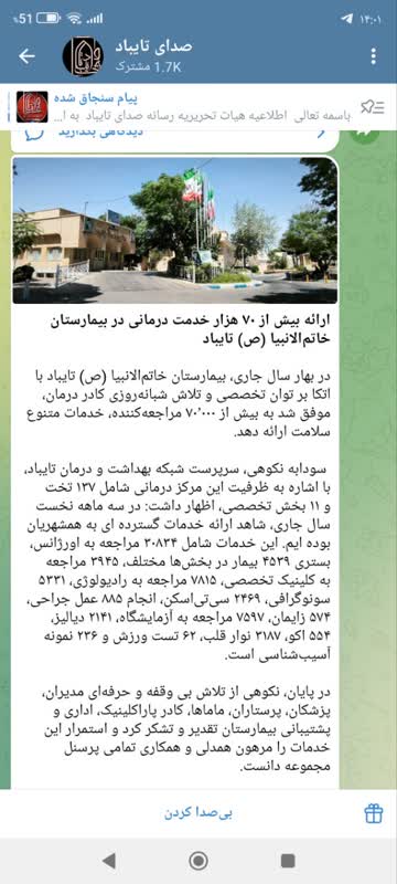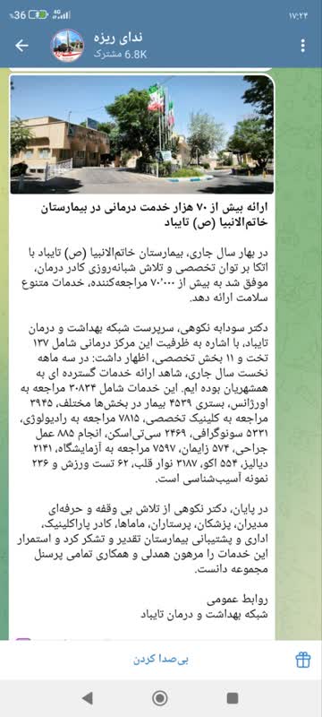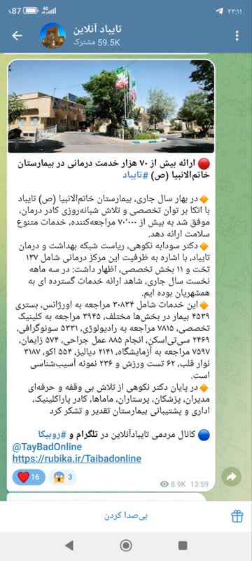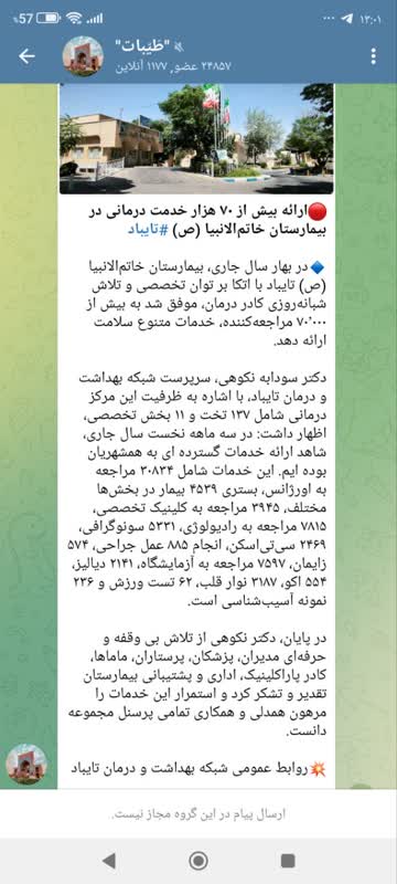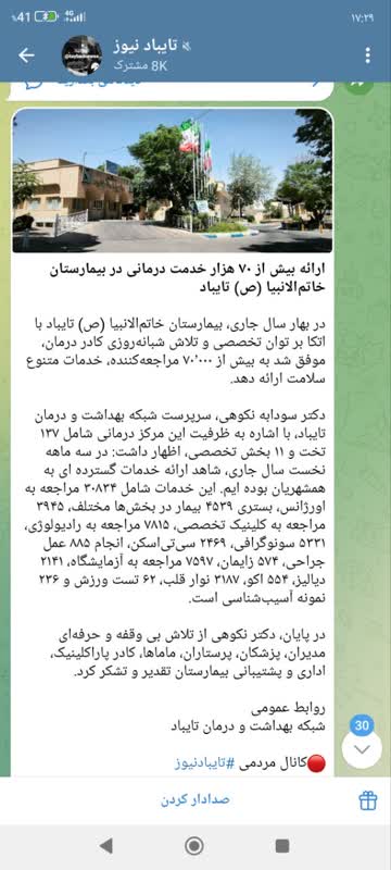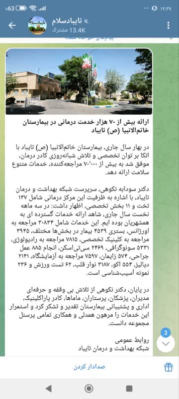 در بهار سال جاری، بیمارستان خاتمالانبیا (ص) تایباد با اتکا بر توان تخصصی و تلاش شبانهروزی کادر درمان، موفق شد به بیش از ۷۰٬۰۰۰ مراجعهکننده، خدمات متنوع سلامت ارائه دهد.