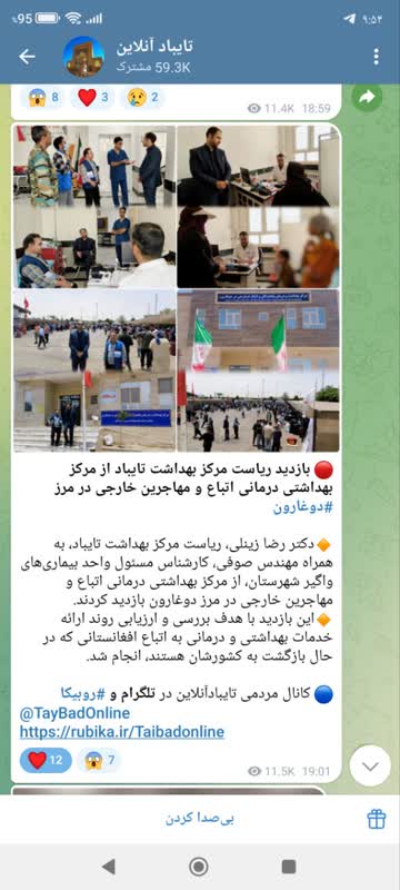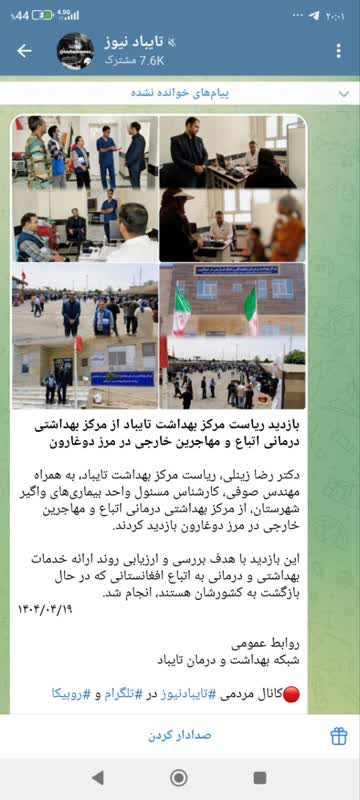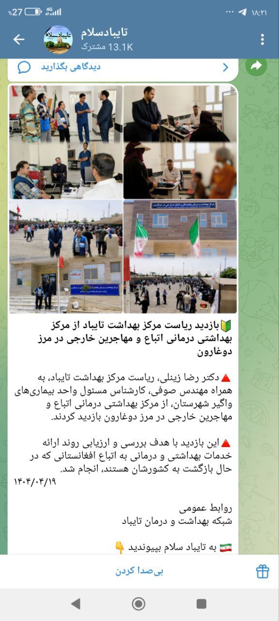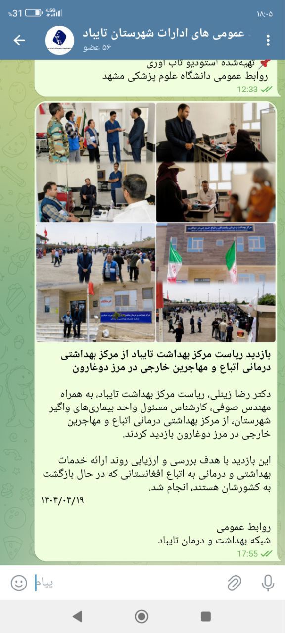 دکتر رضا زینلی، ریاست مرکز بهداشت تایباد، به همراه مهندس صوفی، کارشناس مسئول واحد بیماری‌های واگیر شهرستان، از مرکز بهداشتی درمانی اتباع و مهاجرین خارجی در مرز دوغارون بازدید کردند. این بازدید با هدف بررسی و ارزیابی روند ارائه خدمات بهداشتی و درمانی به اتباع افغانستانی که در حال بازگشت به کشورشان هستند، انجام شد.