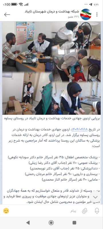سرپرست شبکه بهداشت و درمان تایباد از ارائه خدمات درمانی تخصصی به ۲۶۰ نفر در اردوی جهادی که به همت این شبکه در روستای پساوه شهرستان تایباد برگزار شد، خبر داد.
