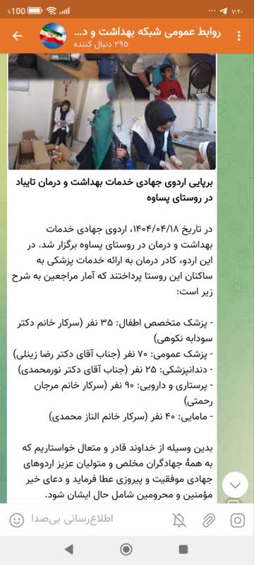 دکتر نکوهی در گفتگو با وب دا اظهار کرد: این اردوی یکروزه شامل ارائه خدمات پزشکی متنوعی بود که به تفکیک شامل ۳۵ ویزیت پزشک متخصص اطفال، ۷۰ ویزیت پزشک عمومی، ۲۵ نفر خدمات دندانپزشکی، ۹۰ نفر خدمات پرستاری و دارویی و ۴۰ نفر خدمات مامایی انجام گرفت.