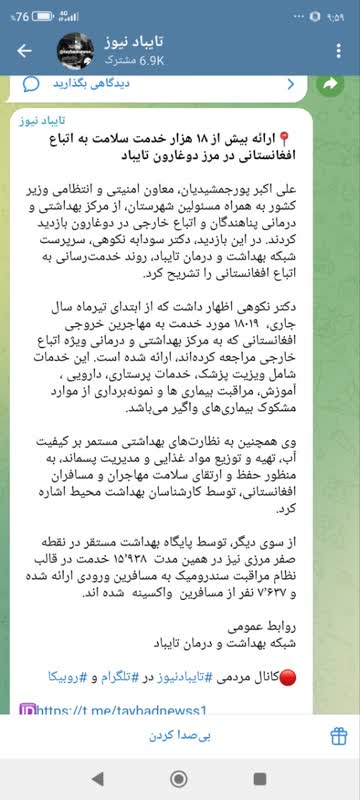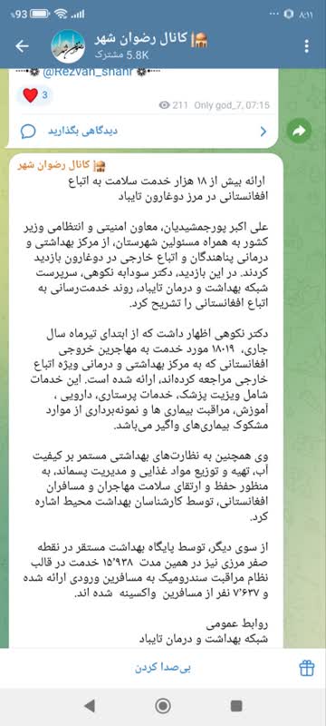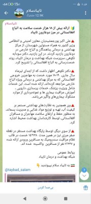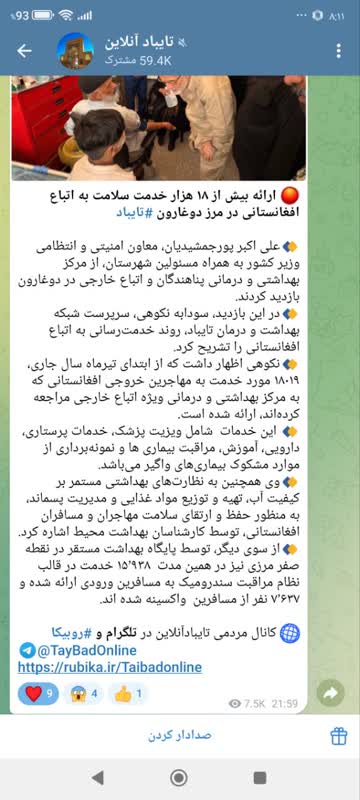 علی اکبر پورجمشیدیان، معاون امنیتی و انتظامی وزیر کشور به همراه مسئولین شهرستان، از مرکز بهداشتی و درمانی پناهندگان و اتباع خارجی در دوغارون بازدید کردند. در این بازدید، دکتر سودابه نکوهی، سرپرست شبکه بهداشت و درمان تایباد، روند خدمترسانی به اتباع افغانستانی را تشریح کرد. دکتر نکوهی اظهار داشت که از ابتدای تیرماه سال جاری، ۱۸۰۱۹ مورد خدمت به مهاجرین خروجی افغانستانی که به مرکز بهداشتی و درمانی ویژه اتباع خارجی مراجعه کردهاند، ارائه شده است. این خدمات شامل ویزیت پزشک، خدمات پرستاری، دارویی ، آموزش، مراقبت بیماری ها و نمونهبرداری از موارد مشکوک بیماریهای واگیر میباشد. وی همچنین به نظارتهای بهداشتی مستمر بر کیفیت آب، تهیه و توزیع مواد غذایی و مدیریت پسماند، به منظور حفظ و ارتقای سلامت مهاجران و مسافران افغانستانی، توسط کارشناسان بهداشت محیط اشاره کرد. از سوی دیگر، توسط پایگاه بهداشت مستقر در نقطه صفر مرزی نیز در همین مدت ۱۵٬۹۳۸ خدمت در قالب نظام مراقبت سندرومیک به مسافرین ورودی ارائه شده و ۷٬۶۳۷ نفر از مسافرین واکسینه شده اند.