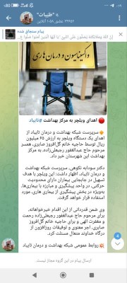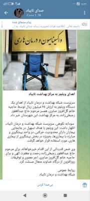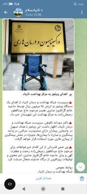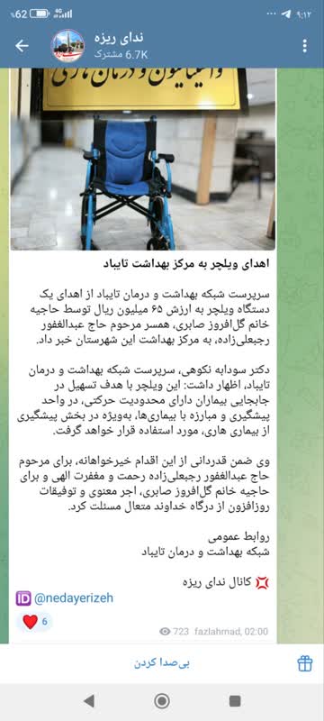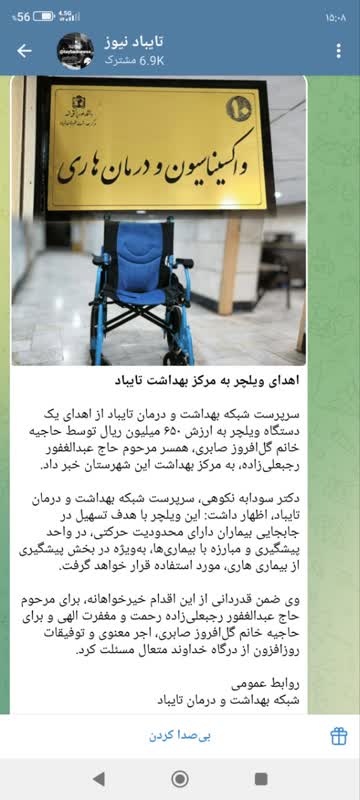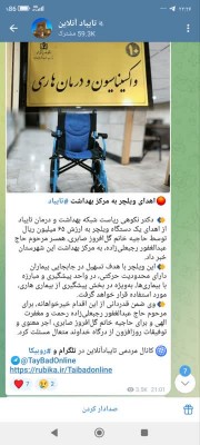 سرپرست شبکه بهداشت و درمان تایباد از اهدای یک دستگاه ویلچر به ارزش ۶۵ میلیون ریال توسط حاجیه خانم گلافروز صابری، همسر مرحوم حاج عبدالغفور رجبعلیزاده، به مرکز بهداشت این شهرستان خبر داد. دکتر سودابه نکوهی، سرپرست شبکه بهداشت و درمان تایباد، اظهار داشت: این ویلچر با هدف تسهیل در جابجایی بیماران دارای محدودیت حرکتی، در واحد پیشگیری و مبارزه با بیماریها، بهویژه در بخش پیشگیری از بیماری هاری، مورد استفاده قرار خواهد گرفت. وی ضمن قدردانی از این اقدام خیرخواهانه، برای مرحوم حاج عبدالغفور رجبعلیزاده رحمت و مغفرت الهی و برای حاجیه خانم گلافروز صابری، اجر معنوی و توفیقات روزافزون از درگاه خداوند متعال مسئلت کرد..