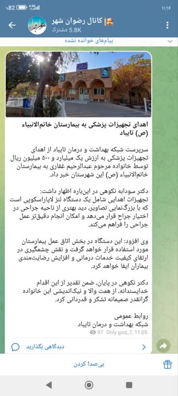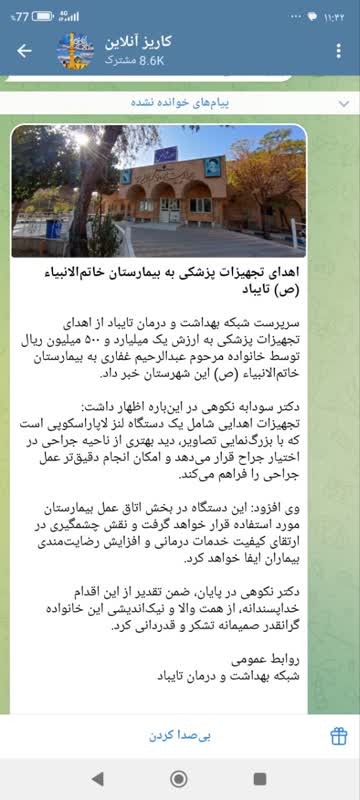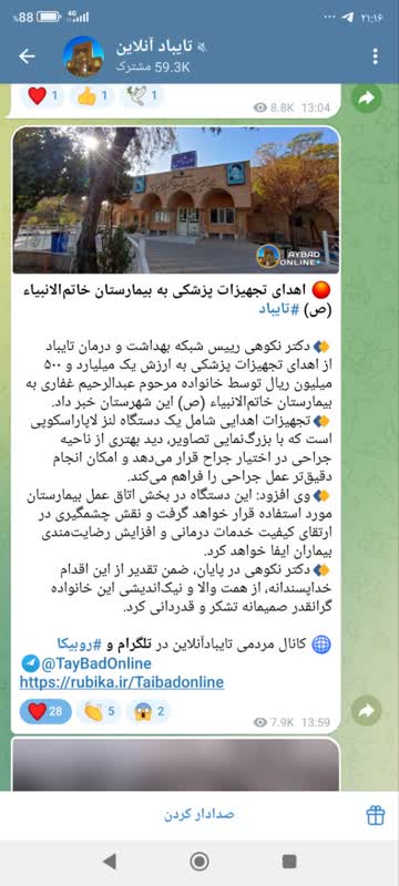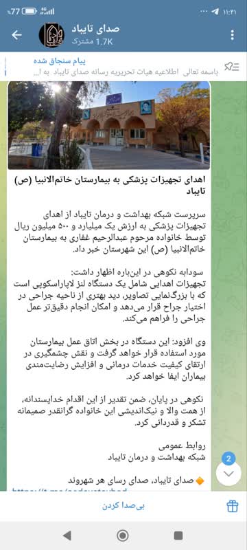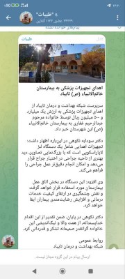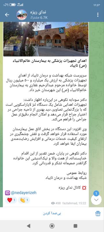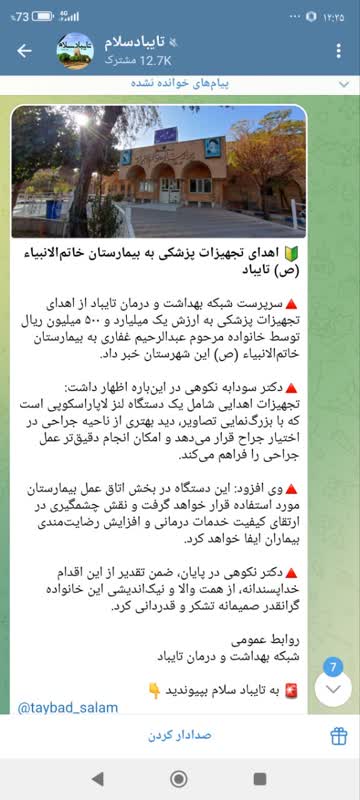سرپرست شبکه بهداشت و درمان تایباد از اهدای تجهیزات پزشکی به ارزش یک میلیارد و ۵۰۰ میلیون ریال توسط خانواده مرحوم عبدالرحیم غفاری به بیمارستان خاتمالانبیاء (ص) این شهرستان خبر داد. دکتر سودابه نکوهی در اینباره اظهار داشت: تجهیزات اهدایی شامل یک دستگاه لنز لاپاراسکوپی است که با بزرگنمایی تصاویر، دید بهتری از ناحیه جراحی در اختیار جراح قرار میدهد و امکان انجام دقیقتر عمل جراحی را فراهم میکند. وی افزود: این دستگاه در بخش اتاق عمل بیمارستان مورد استفاده قرار خواهد گرفت و نقش چشمگیری در ارتقای کیفیت خدمات درمانی و افزایش رضایتمندی بیماران ایفا خواهد کرد. دکتر نکوهی در پایان، ضمن تقدیر از این اقدام خداپسندانه، از همت والا و نیکاندیشی این خانواده گرانقدر صمیمانه تشکر و قدردانی کرد.
