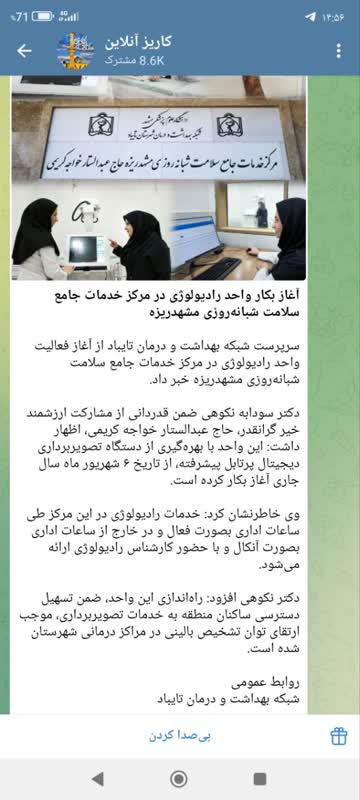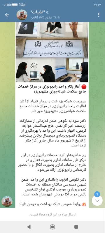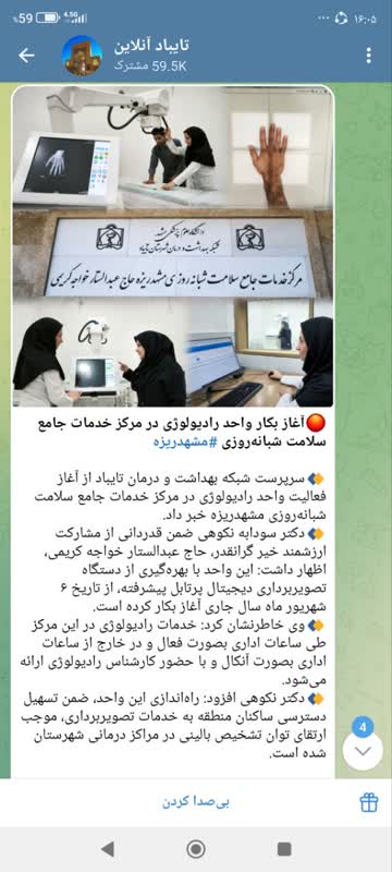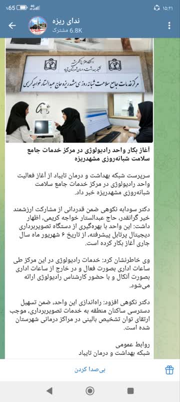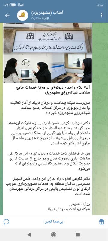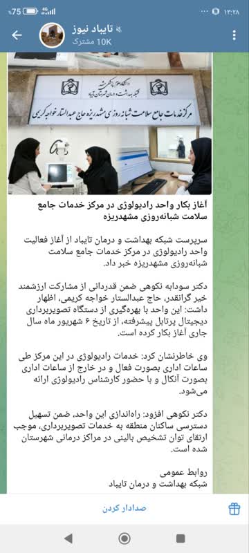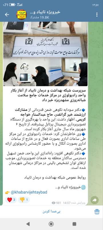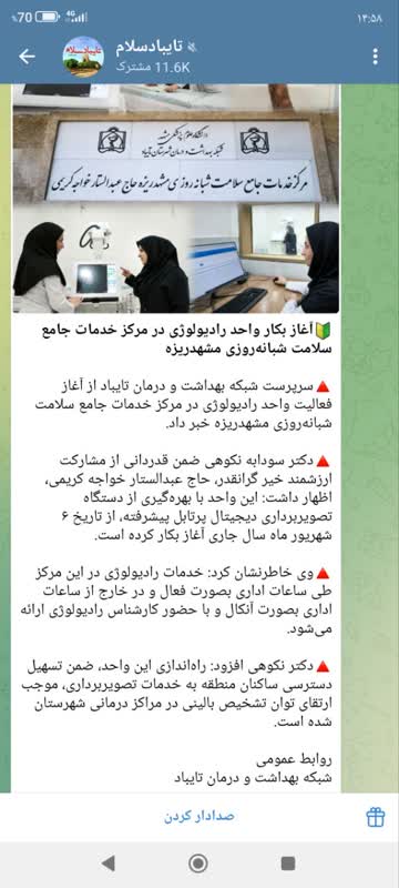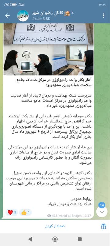 سرپرست شبکه بهداشت و درمان تایباد از آغاز فعالیت واحد رادیولوژی در مرکز خدمات جامع سلامت شبانهروزی مشهدریزه خبر داد. دکتر سودابه نکوهی ضمن قدردانی از مشارکت ارزشمند خیر گرانقدر، حاج عبدالستار خواجه کریمی، اظهار داشت: این واحد با بهرهگیری از دستگاه تصویربرداری دیجیتال پرتابل پیشرفته، از تاریخ ۶ شهریور ماه سال جاری آغاز بکار کرده است. وی خاطرنشان کرد: خدمات رادیولوژی در این مرکز طی ساعات اداری بصورت فعال و در خارج از ساعات اداری بصورت آنکال و با حضور کارشناس رادیولوژی ارائه میشود. دکتر نکوهی افزود: راهاندازی این واحد، ضمن تسهیل دسترسی ساکنان منطقه به خدمات تصویربرداری، موجب ارتقای توان تشخیص بالینی در مراکز درمانی شهرستان شده است.