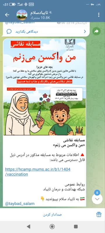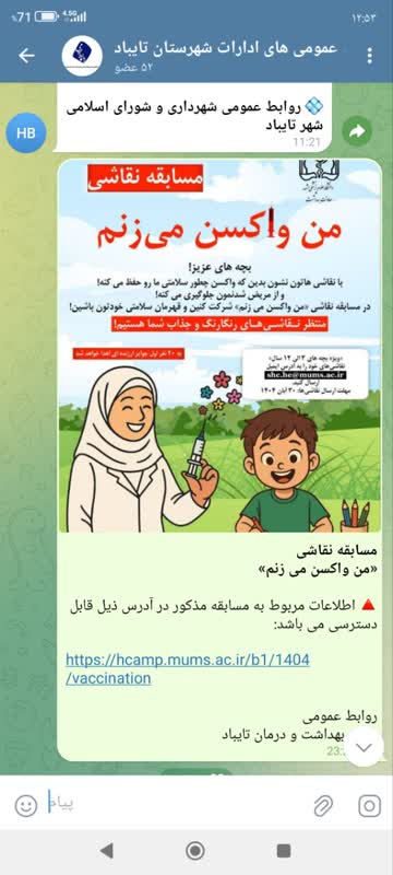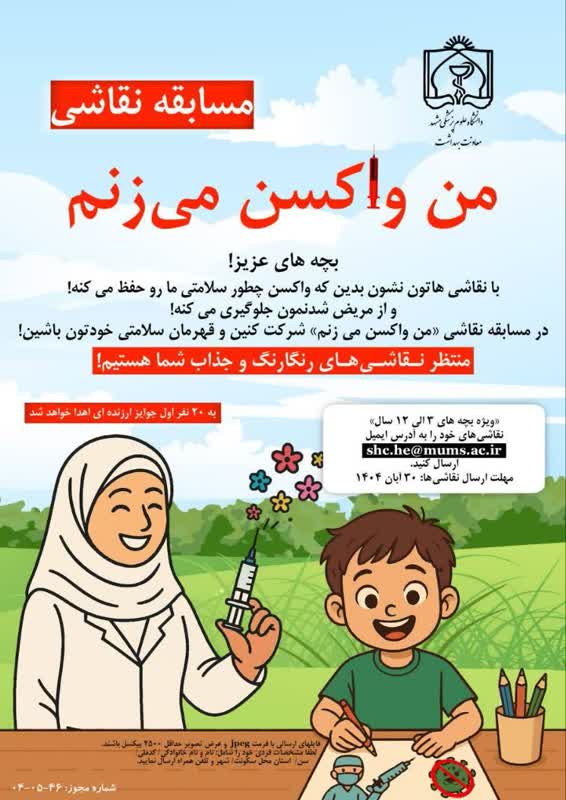 عنوان: من واکسن میزنم - گروه سنی: ۳ تا ۱۲ سال - موضوع: نقش واکسن در سلامت من و خانوادهام - مهلت ارسال آثار: تا ۳۰ آبان ۱۴۰۴ - نحوه ارسال آثار: از طریق ایمیل به نشانی این آدرس ایمیل توسط spambots حفاظت می شود. برای دیدن شما نیاز به جاوا اسکریپت دارید - جوایز: به ۲۰ اثر برتر، جوایز ارزندهای اهدا خواهد شد شرایط ارسال آثار: - فرمت فایل: JPEG - حداقل عرض تصویر: ۲۵۰۰ پیکسل - همراه با مشخصات فردی شامل: - نام و نام خانوادگی - کد ملی - سن - استان و شهر محل سکونت - شماره تلفن همراه