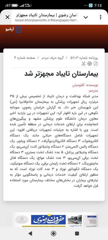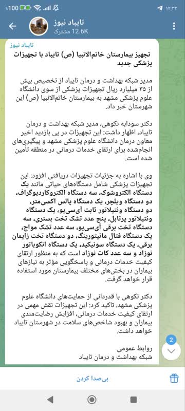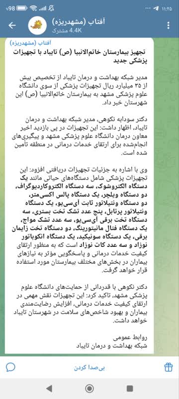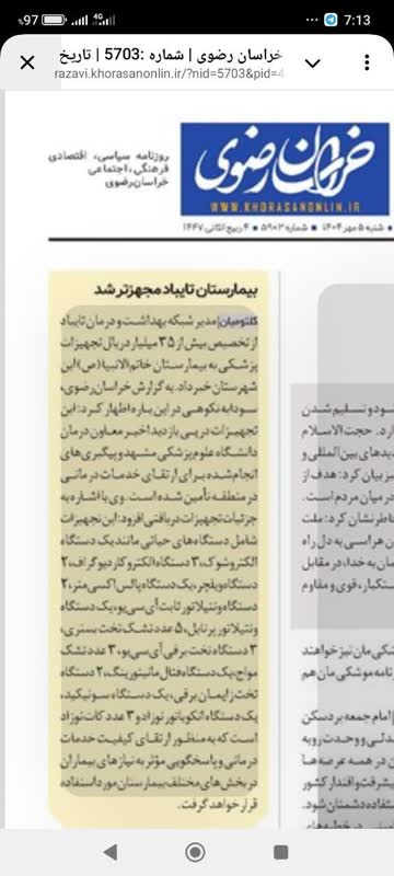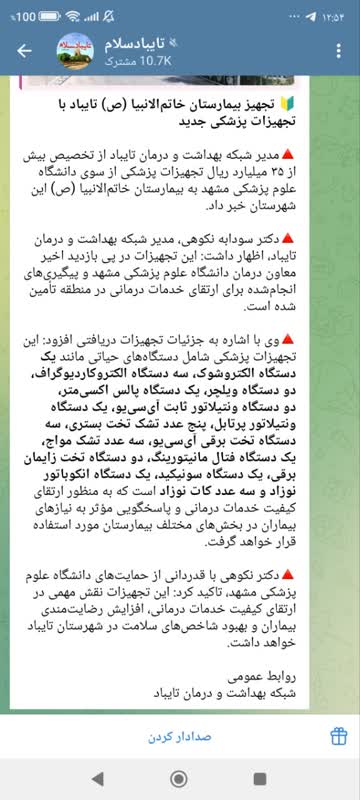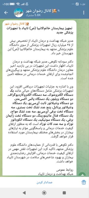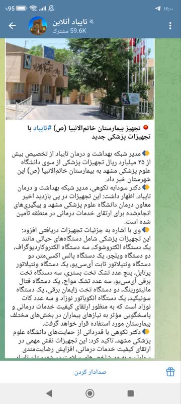 مدیر شبکه بهداشت و درمان تایباد از تخصیص بیش از ۳۵ میلیارد ریال تجهیزات پزشکی از سوی دانشگاه علوم پزشکی مشهد به بیمارستان خاتمالانبیا (ص) این شهرستان خبر داد. دکتر سودابه نکوهی، مدیر شبکه بهداشت و درمان تایباد، اظهار داشت: این تجهیزات در پی بازدید اخیر معاون درمان دانشگاه علوم پزشکی مشهد و پیگیریهای انجامشده برای ارتقای خدمات درمانی در منطقه تأمین شده است. وی با اشاره به جزئیات تجهیزات دریافتی افزود: این تجهیزات پزشکی شامل دستگاههای حیاتی مانند یک دستگاه الکتروشوک، سه دستگاه الکتروکاردیوگراف، دو دستگاه ویلچر، یک دستگاه پالس اکسیمتر، دو دستگاه ونتیلاتور ثابت آیسییو، یک دستگاه ونتیلاتور پرتابل، پنج عدد تشک تخت بستری، سه دستگاه تخت برقی آیسییو، سه عدد تشک مواج، یک دستگاه فتال مانیتورینگ، دو دستگاه تخت زایمان برقی، یک دستگاه سونیکید، یک دستگاه انکوباتور نوزاد و سه عدد کات نوزاد است که به منظور ارتقای کیفیت خدمات درمانی و پاسخگویی مؤثر به نیازهای بیماران در بخشهای مختلف بیمارستان مورد استفاده قرار خواهد گرفت. دکتر نکوهی با قدردانی از حمایتهای دانشگاه علوم پزشکی مشهد، تاکید کرد: این تجهیزات نقش مهمی در ارتقای کیفیت خدمات درمانی، افزایش رضایتمندی بیماران و بهبود شاخصهای سلامت در شهرستان تایباد خواهد داشت.