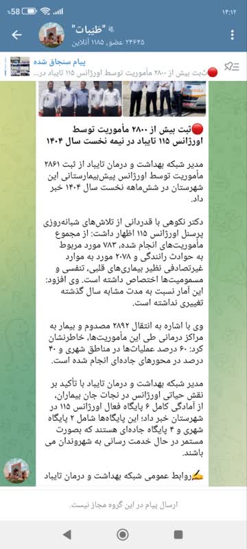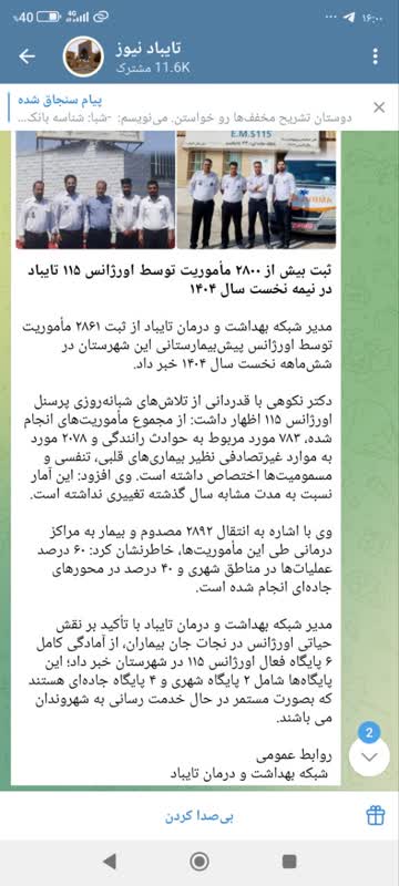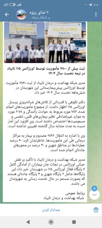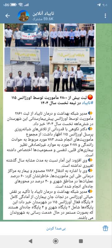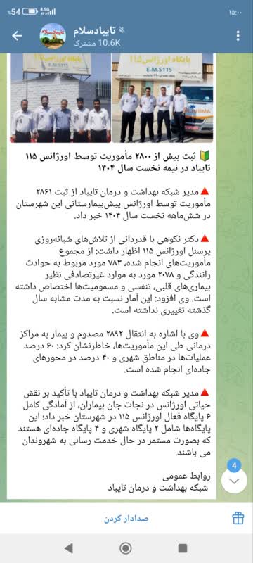 مدیر شبکه بهداشت و درمان تایباد از ثبت ۲۸۶۱ مأموریت توسط اورژانس پیشبیمارستانی این شهرستان در ششماهه نخست سال ۱۴۰۴ خبر داد. دکتر نکوهی با قدردانی از تلاشهای شبانهروزی پرسنل اورژانس ۱۱۵ اظهار داشت: از مجموع مأموریتهای انجام شده، ۷۸۳ مورد مربوط به حوادث رانندگی و ۲۰۷۸ مورد به موارد غیرتصادفی نظیر بیماریهای قلبی، تنفسی و مسمومیتها اختصاص داشته است. وی افزود: این آمار نسبت به مدت مشابه سال گذشته تغییری نداشته است. وی با اشاره به انتقال ۲۸۹۲ مصدوم و بیمار به مراکز درمانی طی این مأموریتها، خاطرنشان کرد: ۶۰ درصد عملیاتها در مناطق شهری و ۴۰ درصد در محورهای جادهای انجام شده است. مدیر شبکه بهداشت و درمان تایباد با تأکید بر نقش حیاتی اورژانس در نجات جان بیماران، از آمادگی کامل ۶ پایگاه فعال اورژانس ۱۱۵ در شهرستان خبر داد؛ این پایگاهها شامل ۲ پایگاه شهری و ۴ پایگاه جادهای هستند که بصورت مستمر در حال خدمت رسانی به شهروندان می باشند.