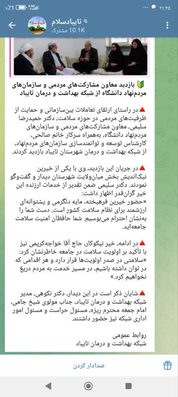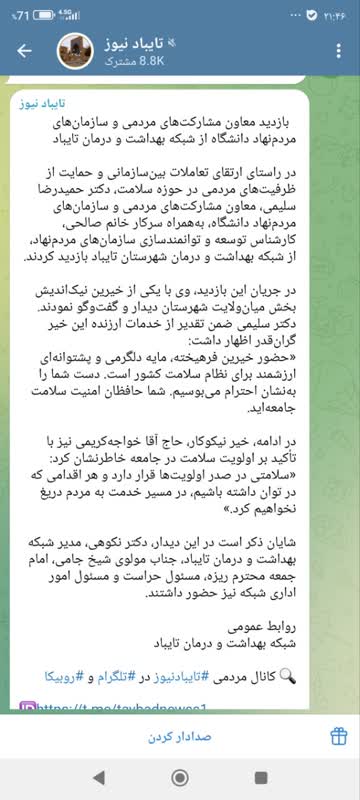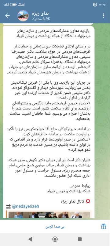 در راستای ارتقای تعاملات بینسازمانی و حمایت از ظرفیتهای مردمی در حوزه سلامت، دکتر حمیدرضا سلیمی، معاون مشارکتهای مردمی و سازمانهای مردمنهاد دانشگاه، بههمراه سرکار خانم صالحی، کارشناس توسعه و توانمندسازی سازمانهای مردمنهاد، از شبکه بهداشت و درمان شهرستان تایباد بازدید کردند. در جریان این بازدید، وی با یکی از خیرین نیکاندیش بخش میانولایت شهرستان دیدار و گفتوگو نمودند. دکتر سلیمی ضمن تقدیر از خدمات ارزنده این خیر گرانقدر اظهار داشت: «حضور خیرین فرهیخته، مایه دلگرمی و پشتوانهای ارزشمند برای نظام سلامت کشور است. دست شما را بهنشان احترام میبوسیم. شما حافظان امنیت سلامت جامعهاید. در ادامه، خیر نیکوکار، حاج آقا خواجهکریمی نیز با تأکید بر اولویت سلامت در جامعه خاطرنشان کرد: «سلامتی در صدر اولویتها قرار دارد و هر اقدامی که در توان داشته باشیم، در مسیر خدمت به مردم دریغ نخواهیم کرد.» شایان ذکر است در این دیدار، دکتر نکوهی، مدیر شبکه بهداشت و درمان تایباد، جناب مولوی شیخ جامی، امام جمعه محترم ریزه، مسئول حراست و مسئول امور اداری شبکه نیز حضور داشتند.