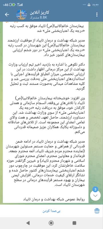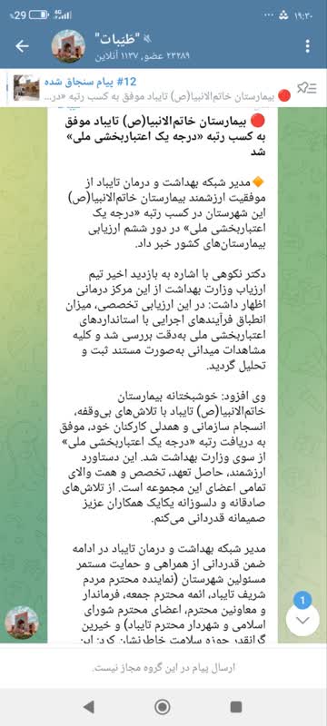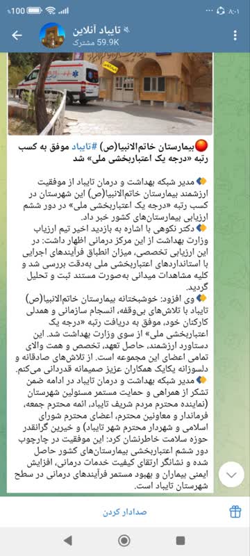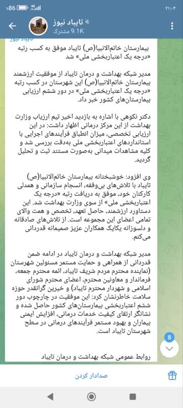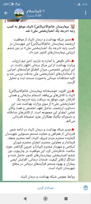 مدیر شبکه بهداشت و درمان تایباد در ادامه ضمن تشکر از حمایتهای مسئولان شهرستان و خیرین حوزه سلامت خاطرنشان کرد:این موفقیت در چارچوب دور ششم اعتباربخشی بیمارستانهای کشور بهدست آمده و نشانگر ارتقای کیفیت خدمات درمانی، افزایش ایمنی بیماران و بهبود مستمر فرآیندهای درمانی در سطح شهرستان تایباد است.