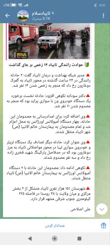 حوادث رانندگی تایباد ۱۴ زخمی بر جای گذاشت
