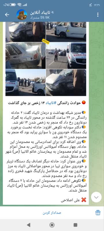 تایباد- ایرنا- مدیر شبکه بهداشت و درمان تایباد گفت: ۲ حادثه رانندگی در ۲۴ ساعت گذشته در محور تایباد به گمرک دوغارون رخ داد که منجر به زخمی شدن ۱۴ نفر شد.