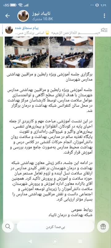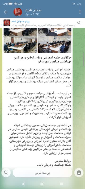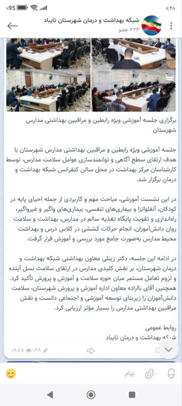 جلسه آموزشی ویژه رابطین و مراقبین بهداشتی مدارس شهرستان با هدف ارتقای سطح آگاهی و توانمندسازی عوامل سلامت مدارس، توسط کارشناسان مرکز بهداشت در محل سالن کنفرانس شبکه بهداشت و درمان برگزار شد.