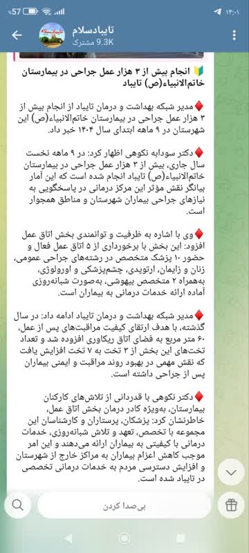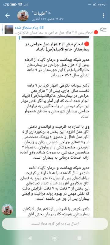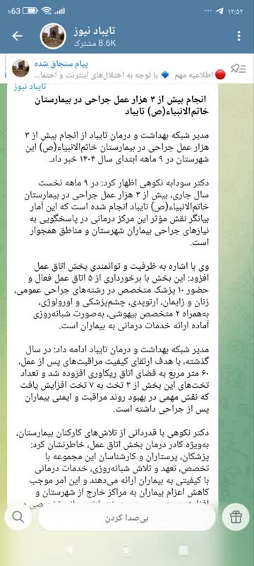 مدیر شبکه بهداشت و درمان تایباد از انجام بیش از ۳ هزار عمل جراحی در بیمارستان خاتمالانبیاء(ص) این شهرستان در ۹ ماهه ابتدای سال ۱۴۰۴ خبر داد.